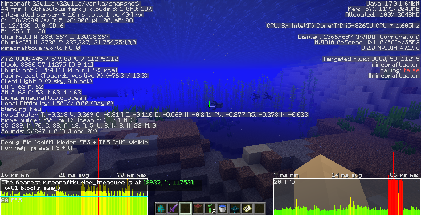 A server-side lag spike sometimes occurs when attempting to locate a buried treasure or opening/breaking a chest containing a map. Some players have reported crashes caused by this issue, one of which is attached.