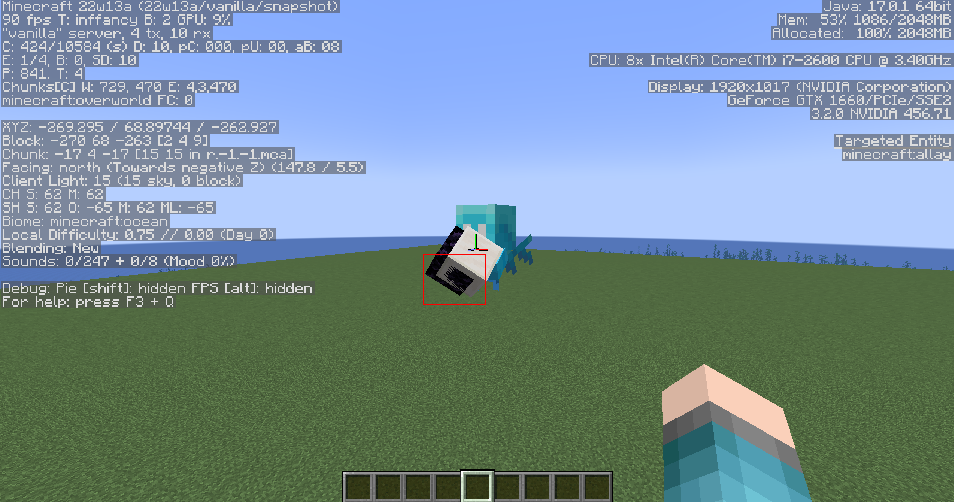 /summon minecraft:allay ~ ~ ~ {Silent:1b,NoAI:1b,HandItems:[{id:"minecraft:obsidian",Count:1b},{id:"minecraft:quartz_block",Count:1b}]}