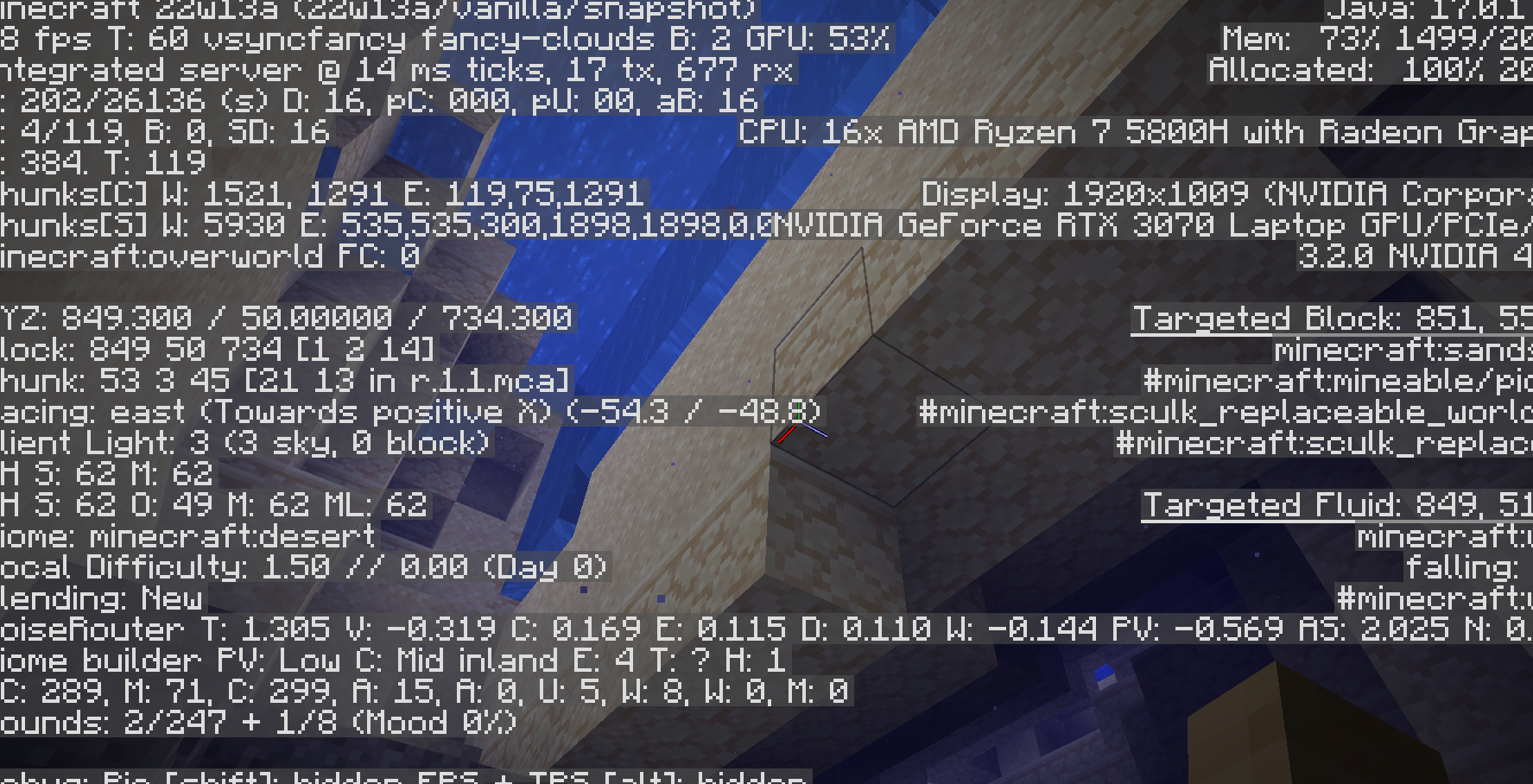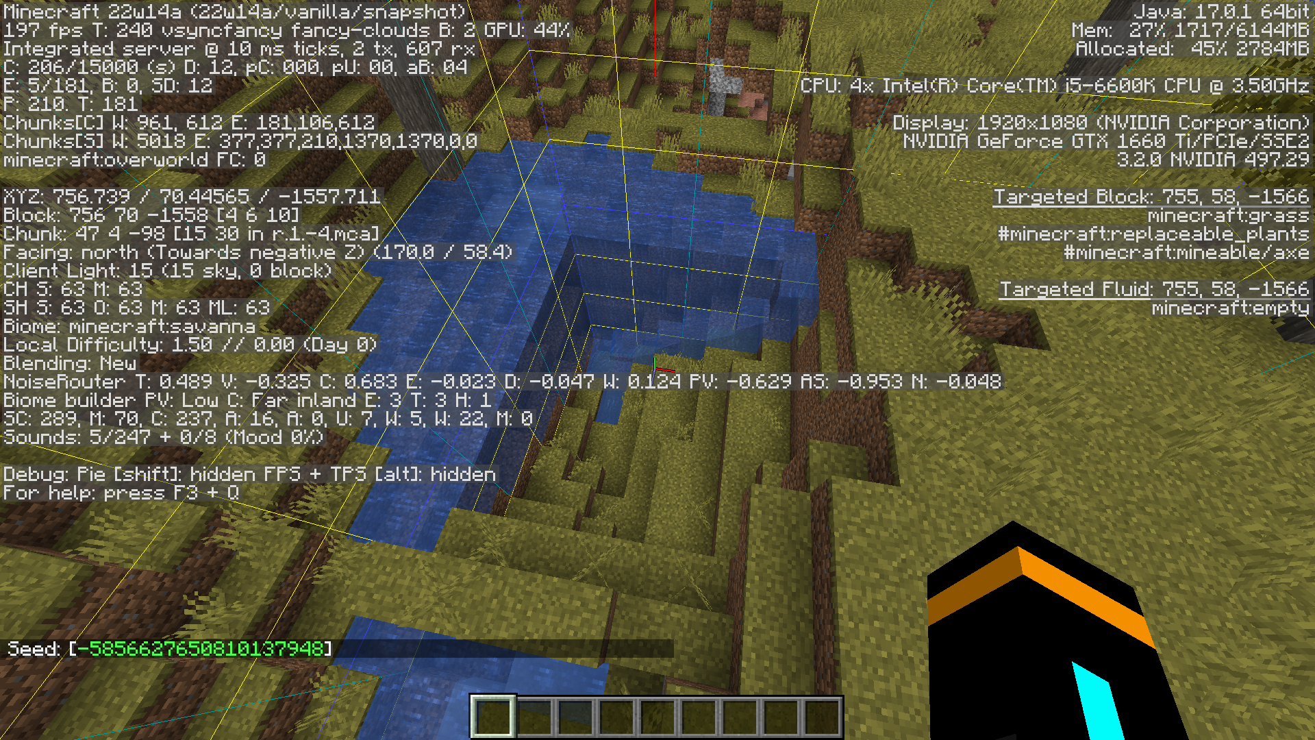 Aquifers can break in certain chunks, which did not happen in 1.18.2. To reproduce, use the seed 147974334 and run the following command:
