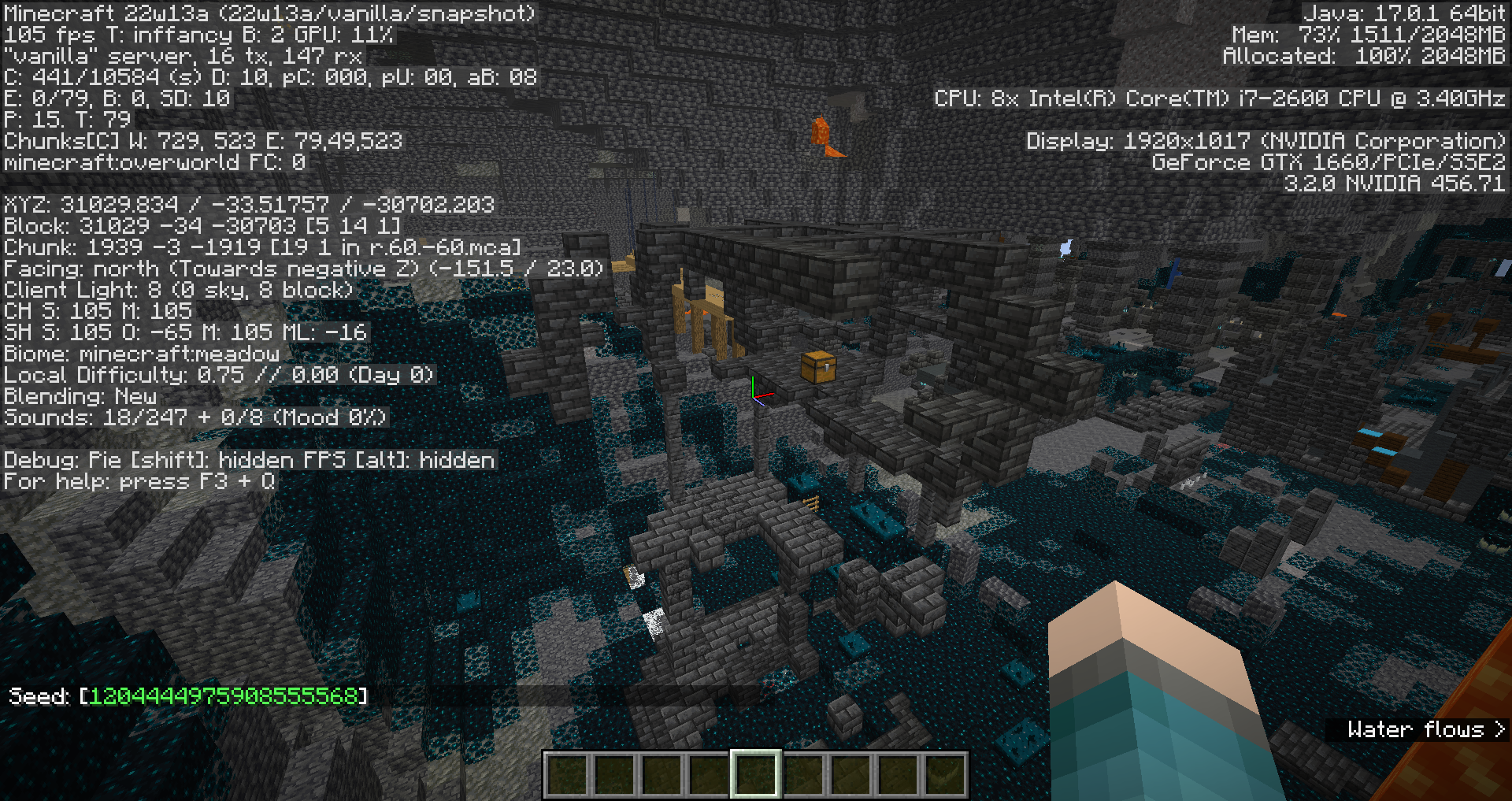 Coordinates: /execute in minecraft:overworld run tp @s 552.86 -35.25 -1380.48 -987.82 26.56Take note as to whether or not caves can occasionally interfere with the generation of ancient cities.