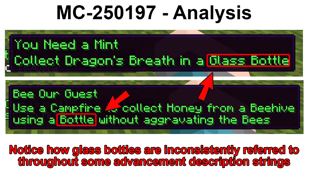 /advancement grant @s only minecraft:husbandry/safely_harvest_honey/advancement grant @s only minecraft:end/dragon_breathLook at the advancement descriptions closely and take note as to whether or not glass bottles are inconsistently referred to.