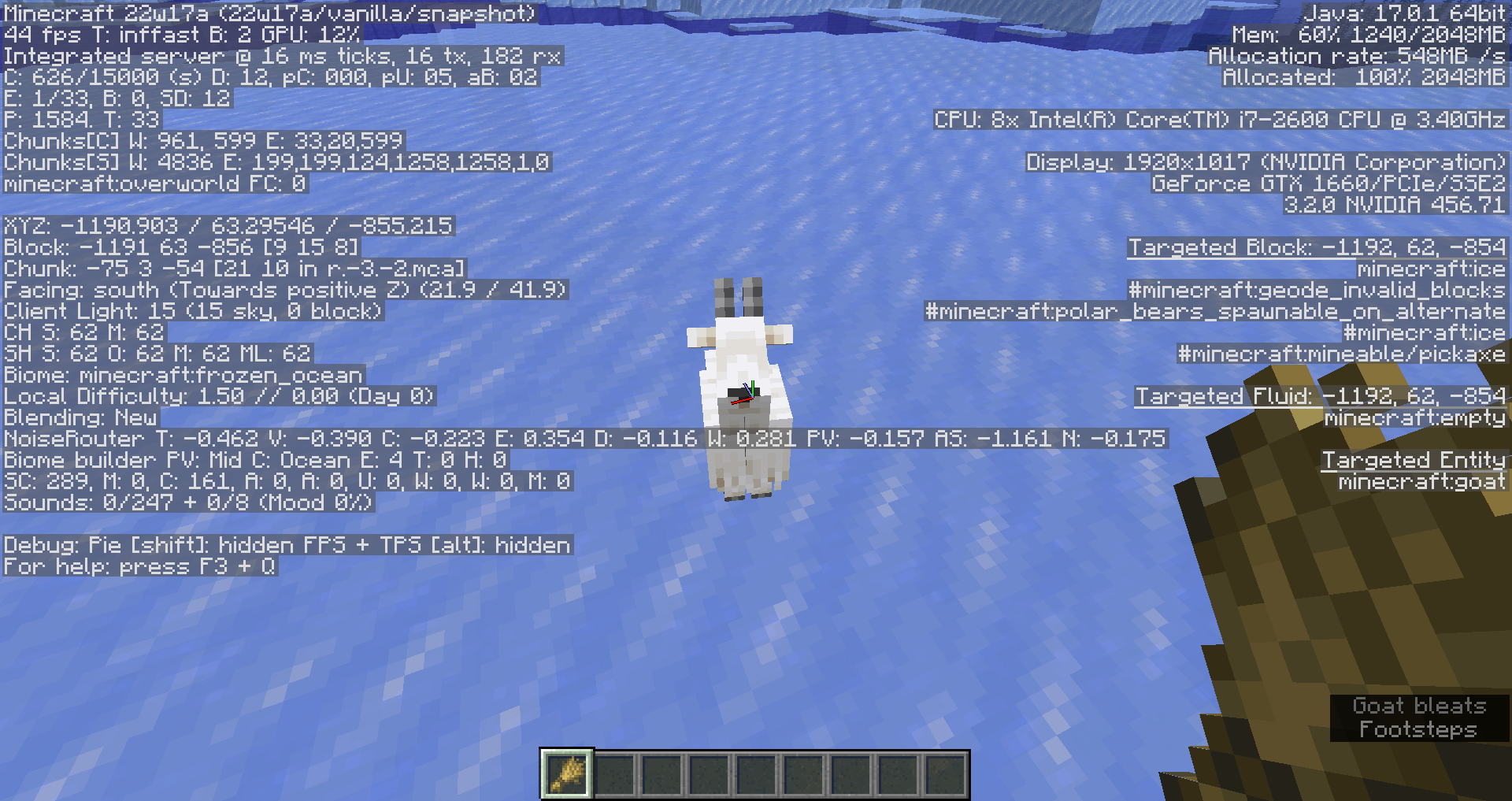 /summon minecraft:goat ~ ~ ~ {Age:-25000,HasLeftHorn:1b,HasRightHorn:1b}Obtain some wheat and feed it to the goat.