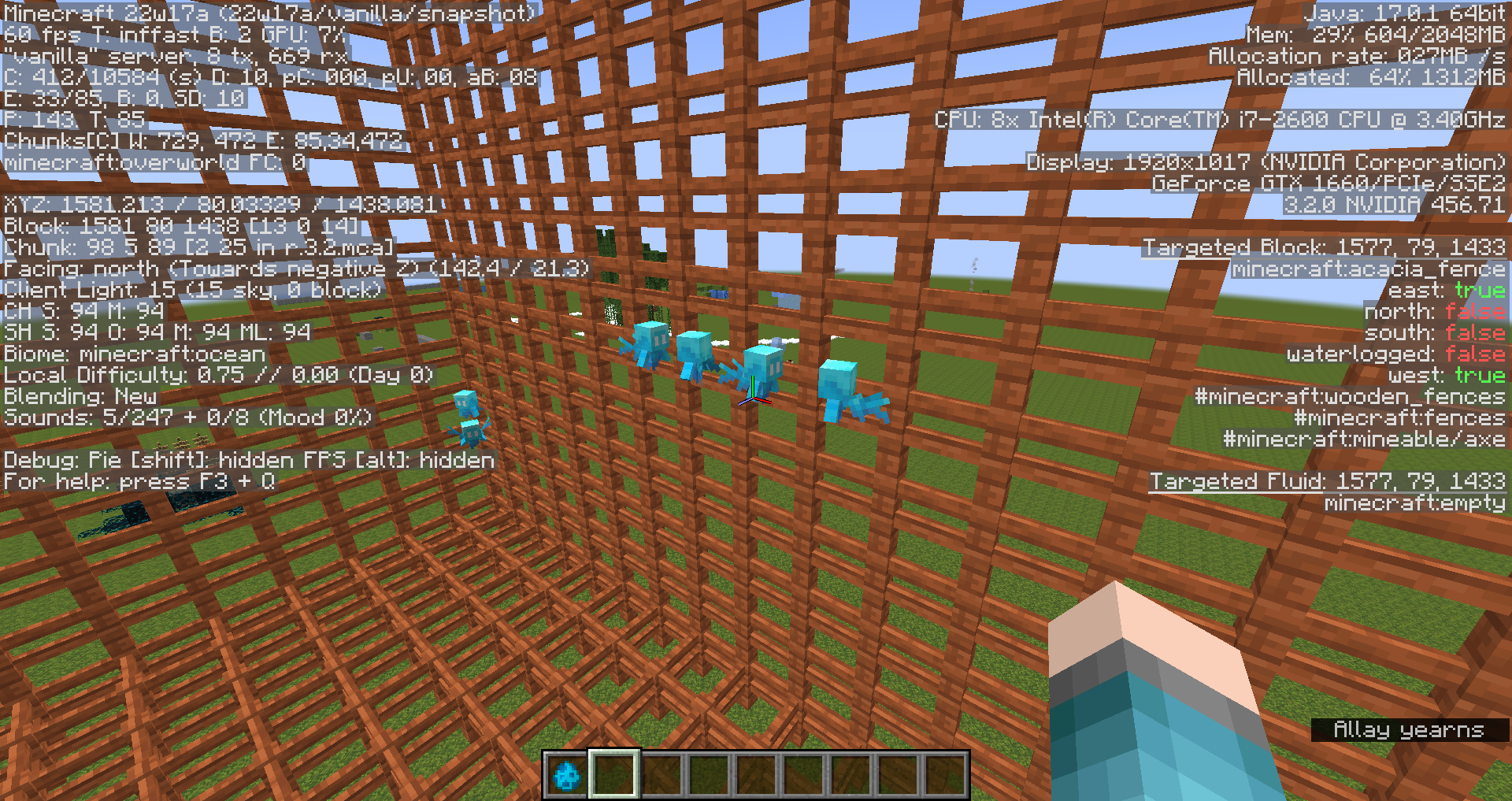 /fill ~20 ~-20 ~20 ~ ~ ~ minecraft:acacia_fence hollowSummon allays inside and outside the fence cube.