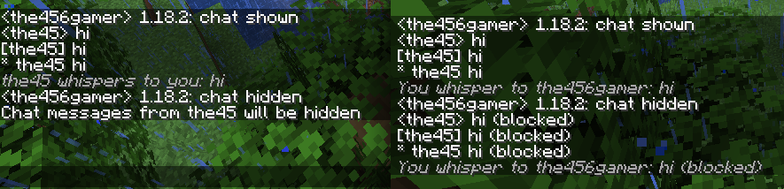 1: chat from 2 shown2: hi2: /say hi2: /me hi2: /msg 1 hi1: chat from 2 hidden2: hi2: /say hi2: /me hi2: /msg 1 hi