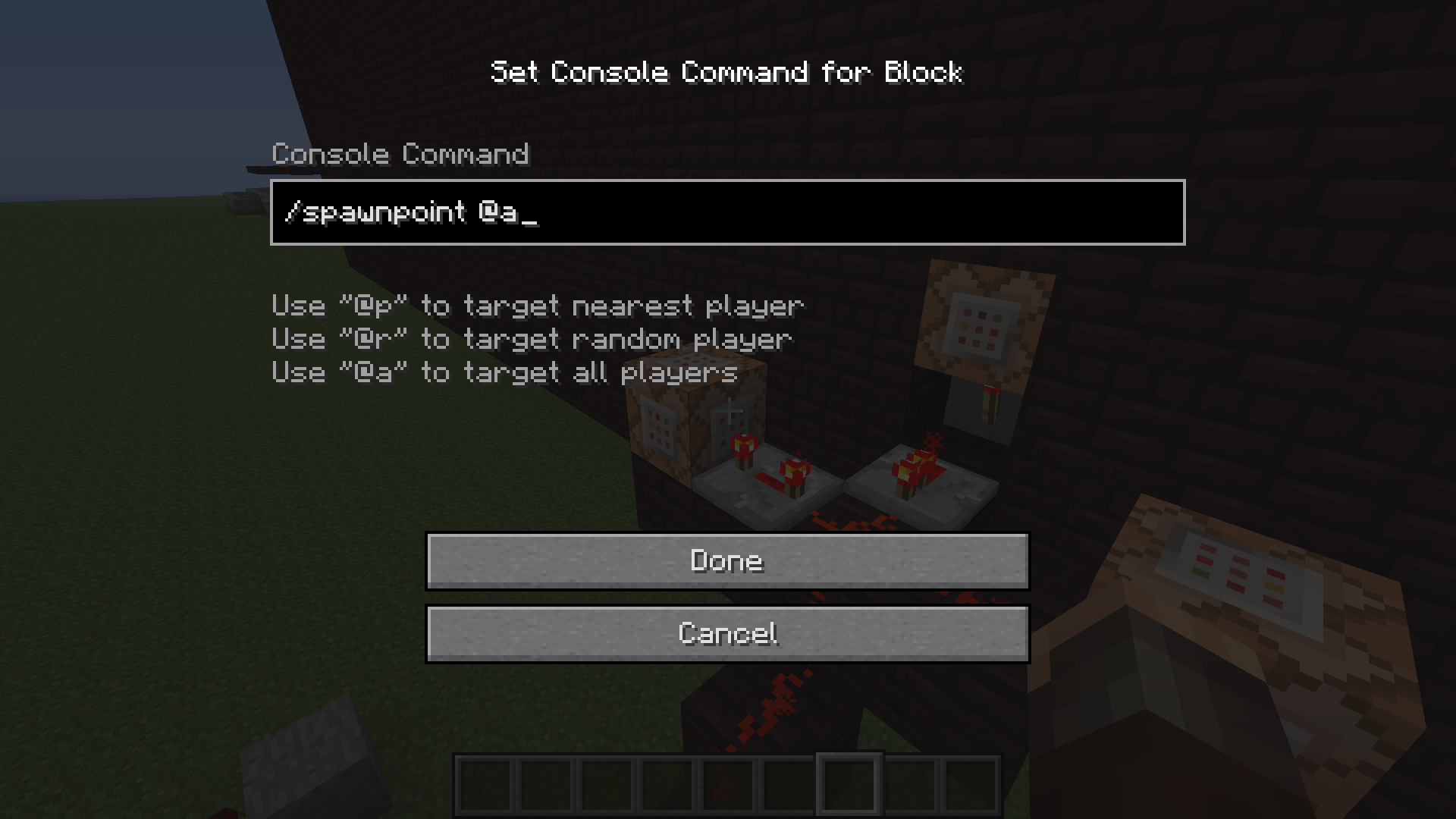 first picture is how i have it set up.. command block in the back is the one that teleports the playerand a repeater set to .1 seconds.. the one on the left is the one that has "/spawnpoint @a" set to it and has a repeater set to .4 seconds.. i've tried it with cords but it doesn't seem to make a difference the one on the right is just a /saw command that tells the player the objective.. the bottom picture is just what the top pictures left command block has in it