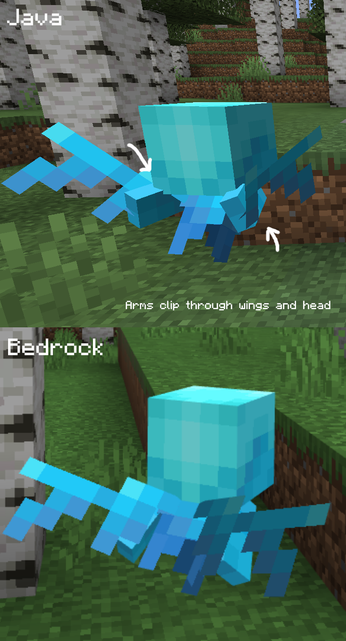 The Allay's Bedrock dancing animation VS its Java dancing animation is perhaps the most noticeable discrepancy. The subtle little wind up, and posed, flared out wings during the spin in Bedrock's is a far cry from the very simplistic model rotation Java's animation has.