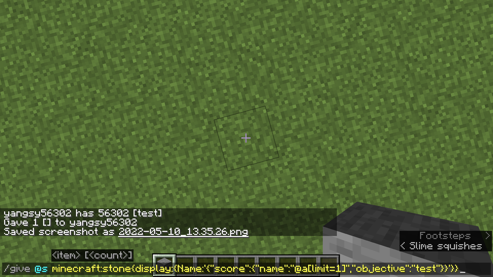 /give @s minecraft:stone{display:{Name:'{"score":{"name":"@a[limit=1]","objective":"test"}}'}}