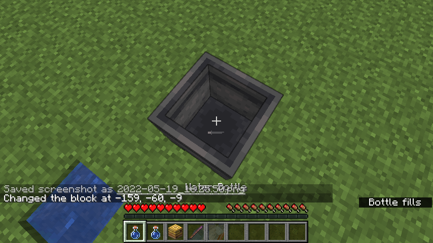If a single water bottle is filled from a water block, the Gear equips sound is played. This does not appear to apply to stacked bottles, and water cauldrons are seemingly unaffected.