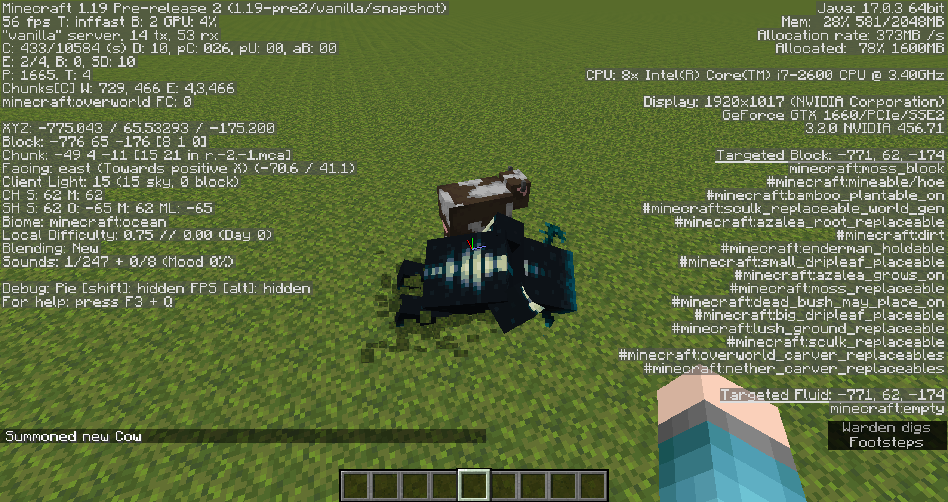 /summon minecraft:cow ~ ~ ~ {Passengers:[{id:"minecraft:warden"}]}Observe the behavior of the warden as soon as it's summoned.