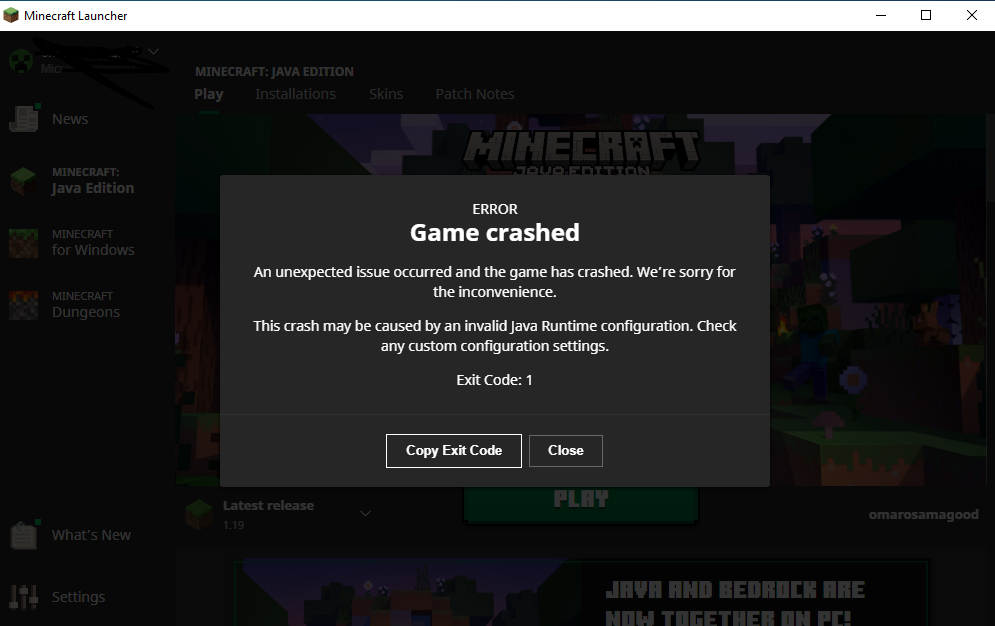 I was trying to play 1.19 for the frist time when i found the the game a soon as it started it crashed with a exit code of 1 i was really confused because i tried more than 5 time to play and it crashes agine then i reinstalled the lancher and the game but it didnt also work and my pc is not my problem because it very good and meet the recommended of what to play the game and of the other versions runs fineΒ