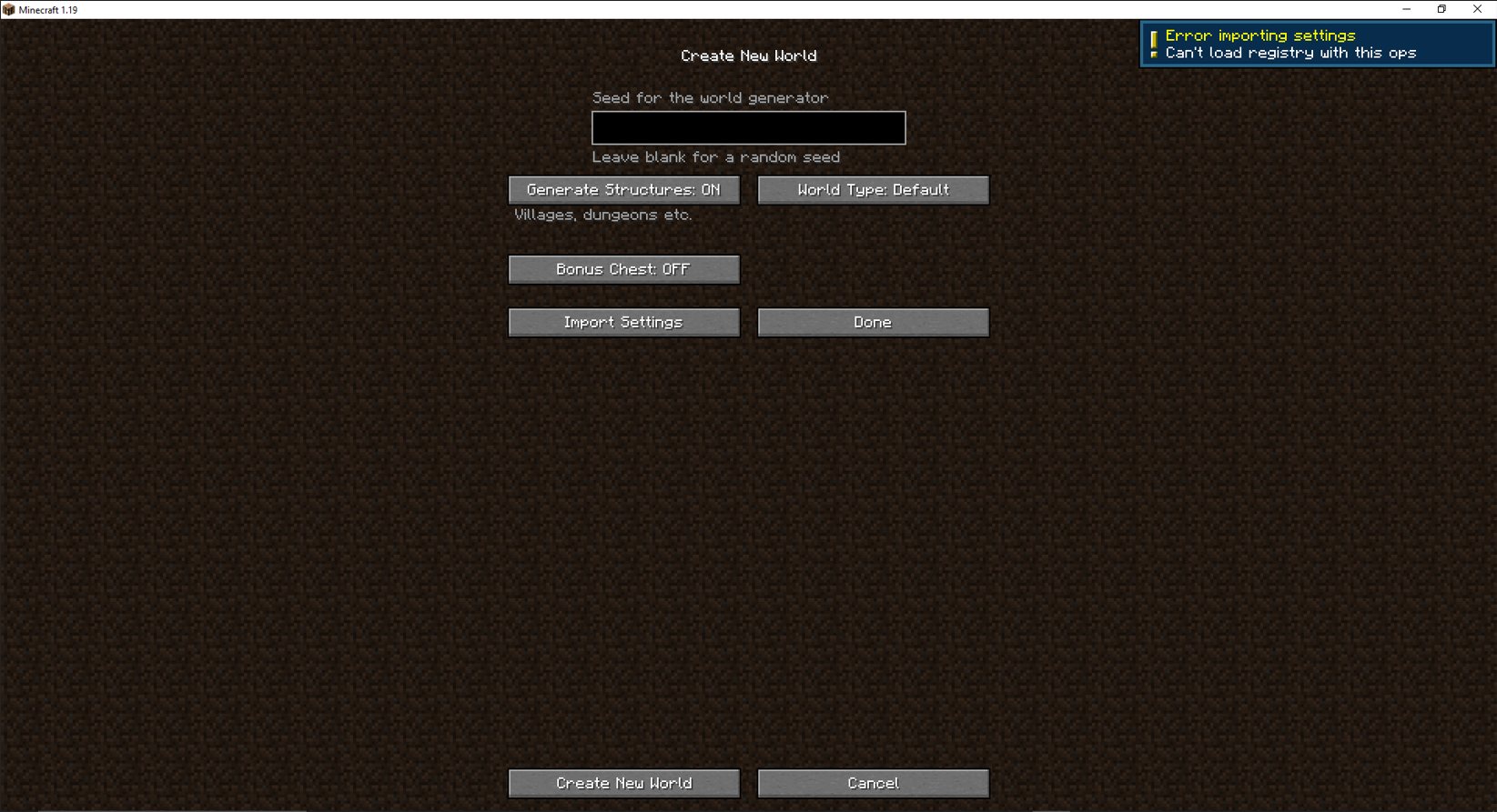 I've noticed an issue with the import settings for making new worlds. When ever I export worldgen settings and try to import them into a new world I keep getting the error in the attached image.