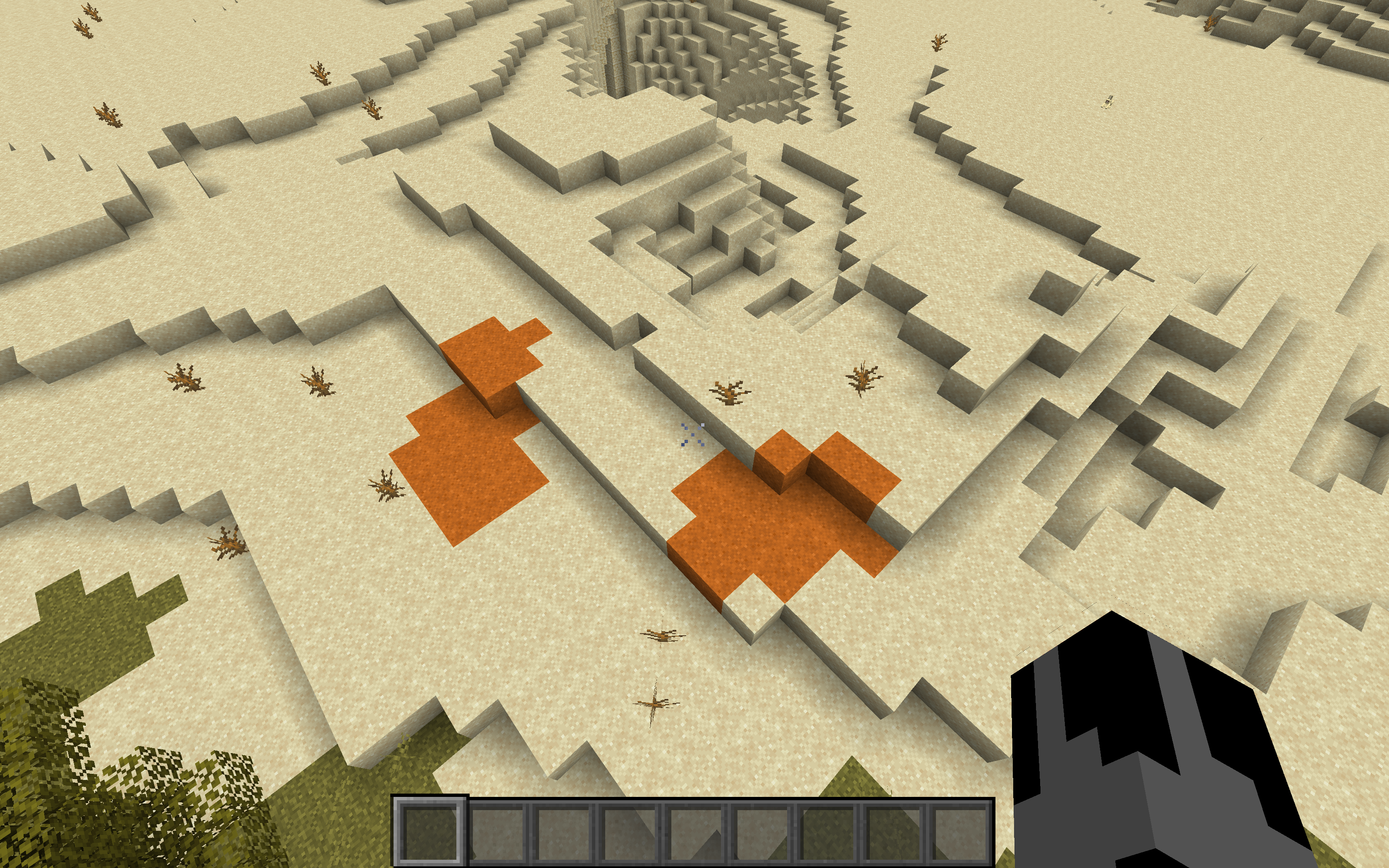 A small slice of a Badlands biome generated in the middle of a desert biome, near the desert's border with a savanna biome. When loaded in 1.18.2, spires of terracotta appear in an Eroded Badlands biome (see first screenshot), whereas when loaded in 1.19, it is only patches of sand from a regular Badlands biome (see second screenshot).