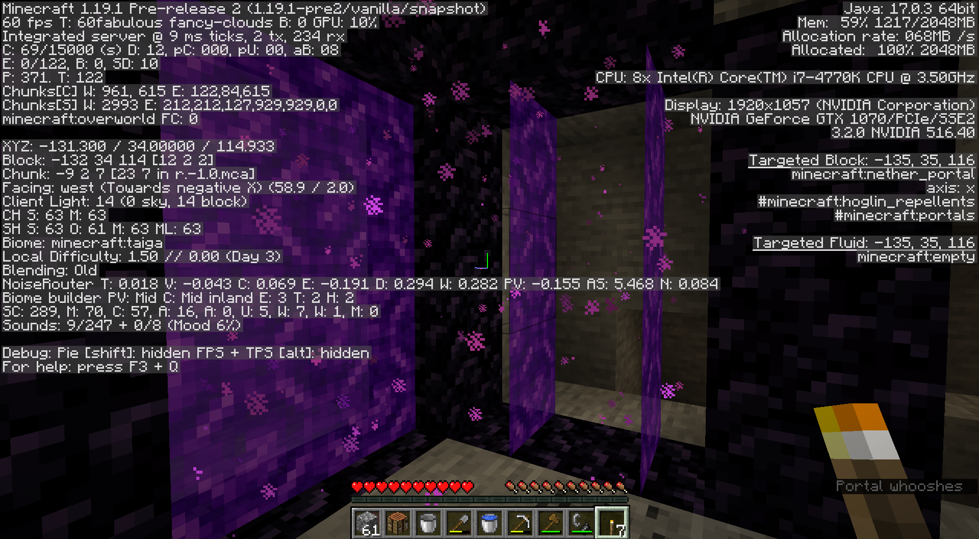 Load an instance of Minecraft beta 1.7.3, create a new world, and construct a nether portal