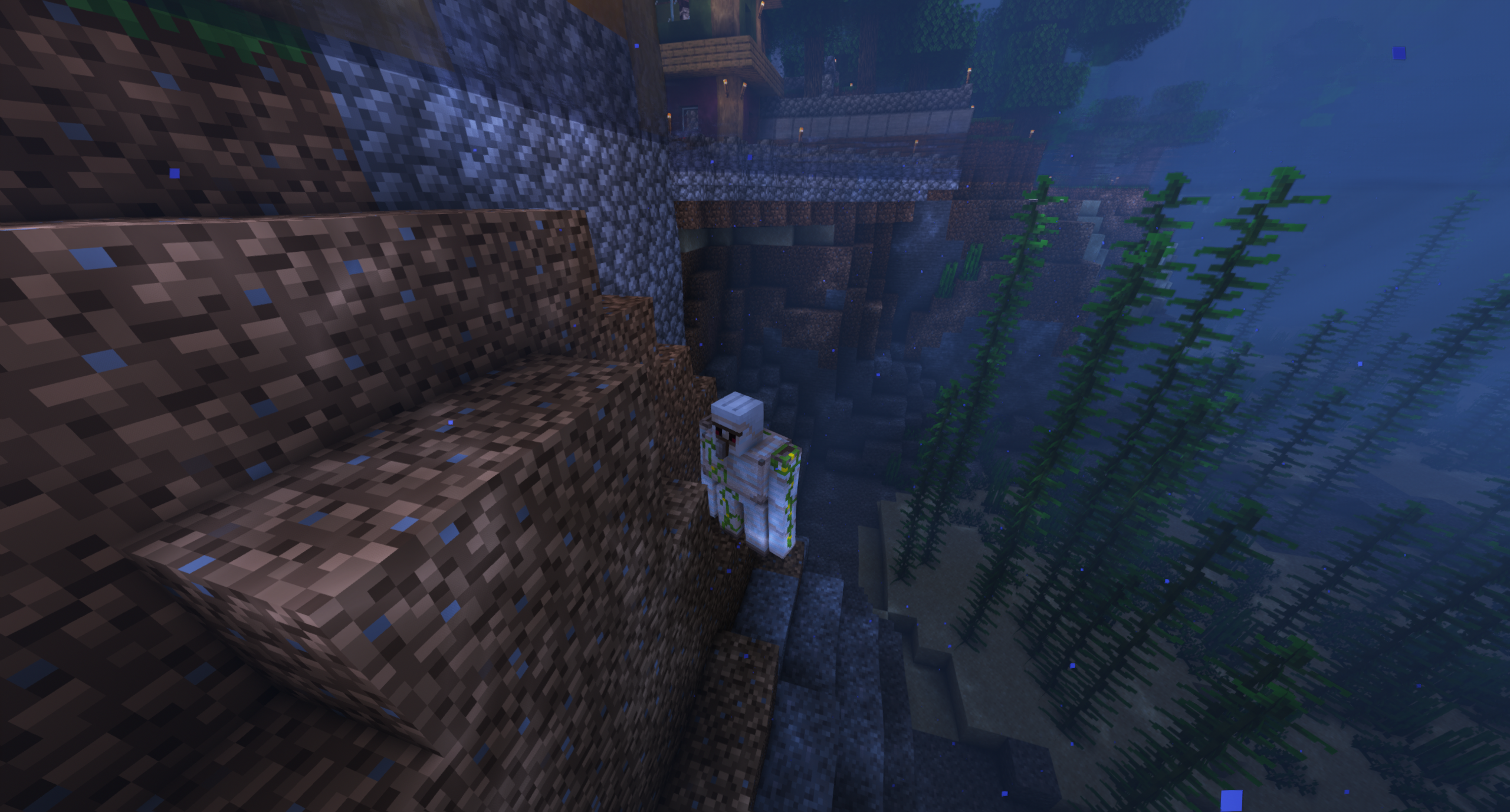 Iron golems can't float and/or swim and just sink to the bottom of any water source. They will do this very commonly if a lake/river/body of water is within or near a village. They walk into the water and sink. Screenshot is provided below. They do not take damage but also do not move and cannot get out.