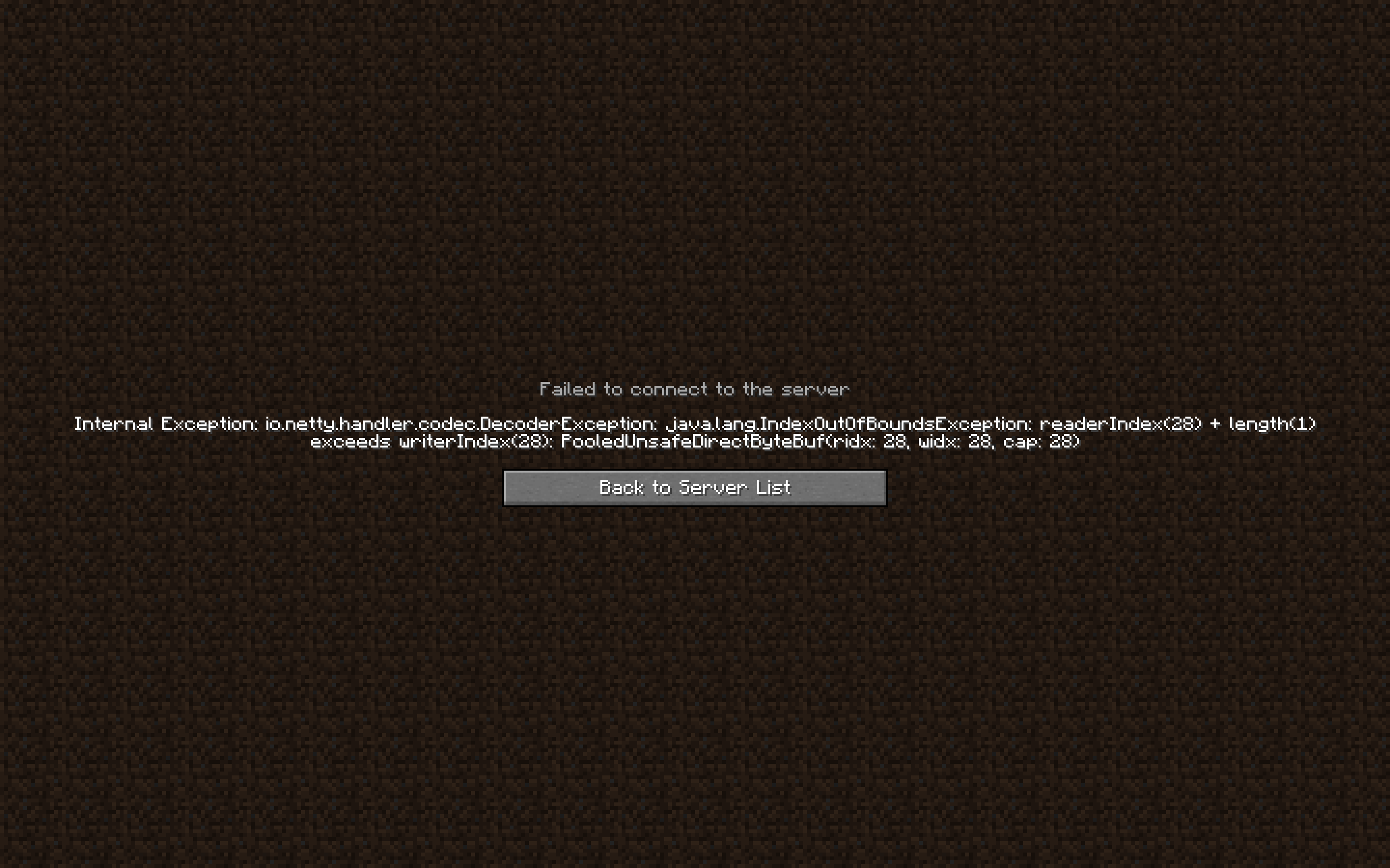 internal exception: io.netty.handler.codec.Decoderexception: java.lang.IndexOut OfBoundsException: readerIndex(28) + length(1) exceeds writerIndex(28): PooledUnsafeDirectByteBuf(ridx: 28, widx: 28, cap: 28