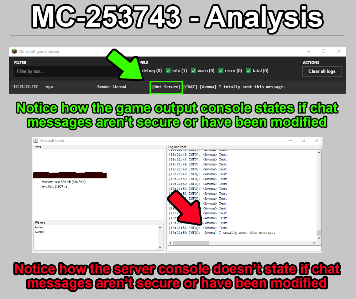 The server console doesn't state if chat messages aren't secure or have been modified.