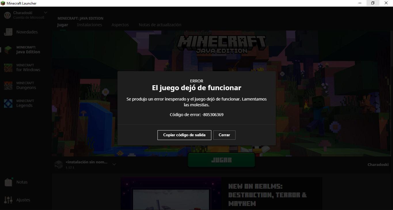 it does not let play the previous versions of 1.19 the error is -805306369