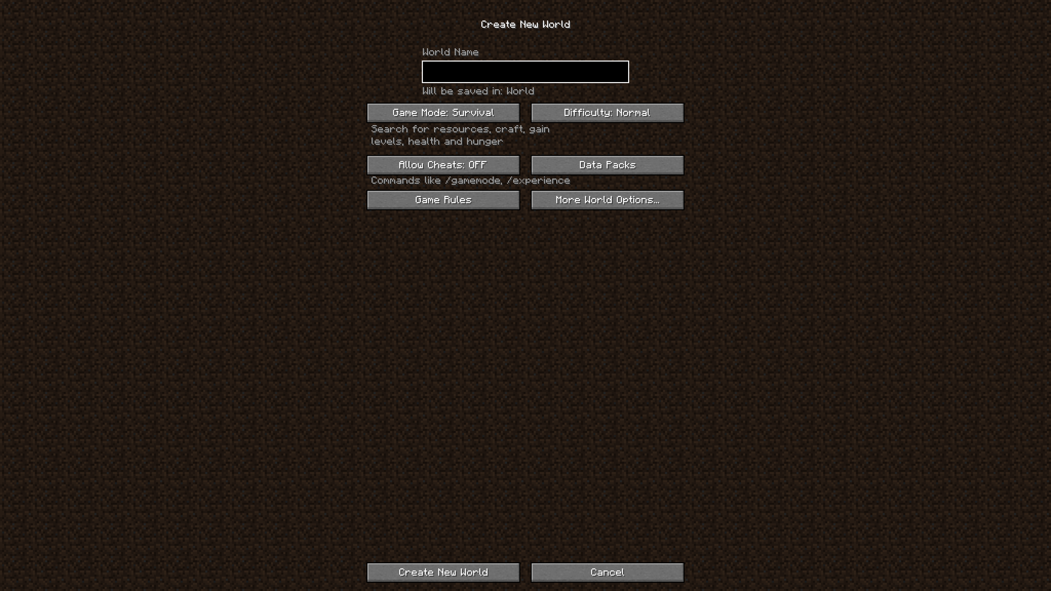 the game says Will be saved in "World" when the world name is empty, but it is not, in fact the Create new world button is grayed out and cannot be pressed. Yet (according to Shuddery) it does not make sense that a single space " ", for example, can be saved as "World" and a world can be created.