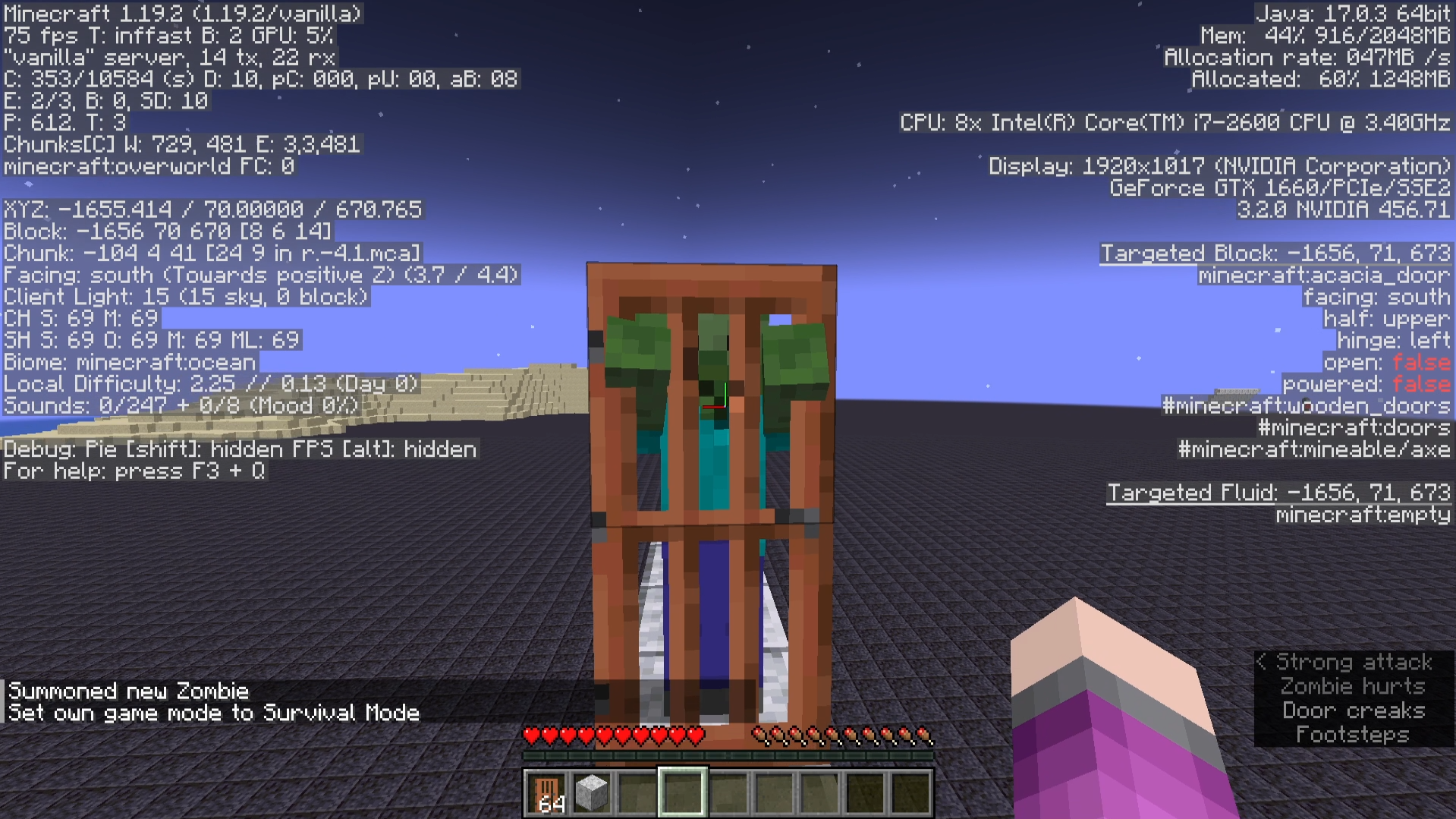 Take note as to whether or not the "minecraft:entity.zombie.attack_wooden_door" sound sometimes doesn't immediately or consistently play when zombies attack doors.