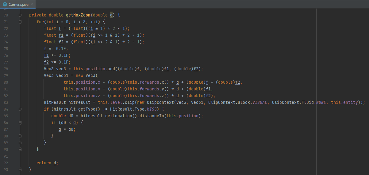 I don't think that " + (double)f3" in the line marked with " // <-- What?" is intentional. This should be removed. Ingame this leads to slightly wrong camera distances in the 3rd person views (front and back), if the camera hits an obstacle.