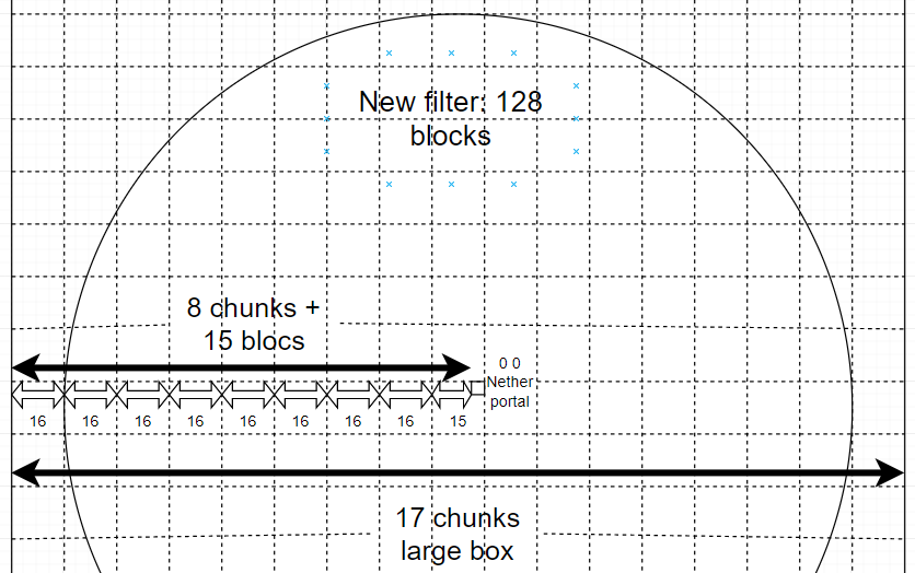 @[[Mod] ampolive|https://bugs.mojang.com/secure/ViewProfile.jspa?name=ampolive] , I've seen this issue too and it's not a duplicate. MC-183103 refers to the portal mechanic introduced in 1.15. The range was too large because the search for the game was looking for the portal in the surrounding chunks, in a box of 17*17 chunks centered on the chunk containing the ideal block portal of arrival. It means that if your portal block was on the bordure of a chunk, the maximal teleportation distance was 8 * 16 + 15 = 143. You can see the diagram illustrating this below.