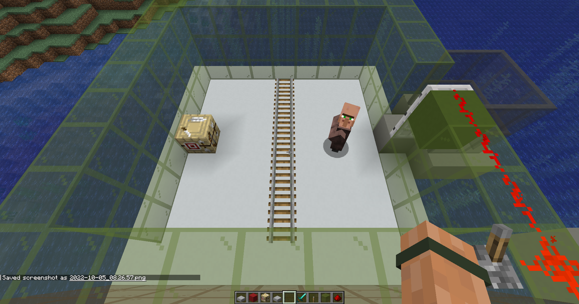 In the video, you can see two boxes, each with a rail going through the middle. In the left (red) box, the floor is elevated by a half slab on the villager side, on the right, the floor is on rail level.