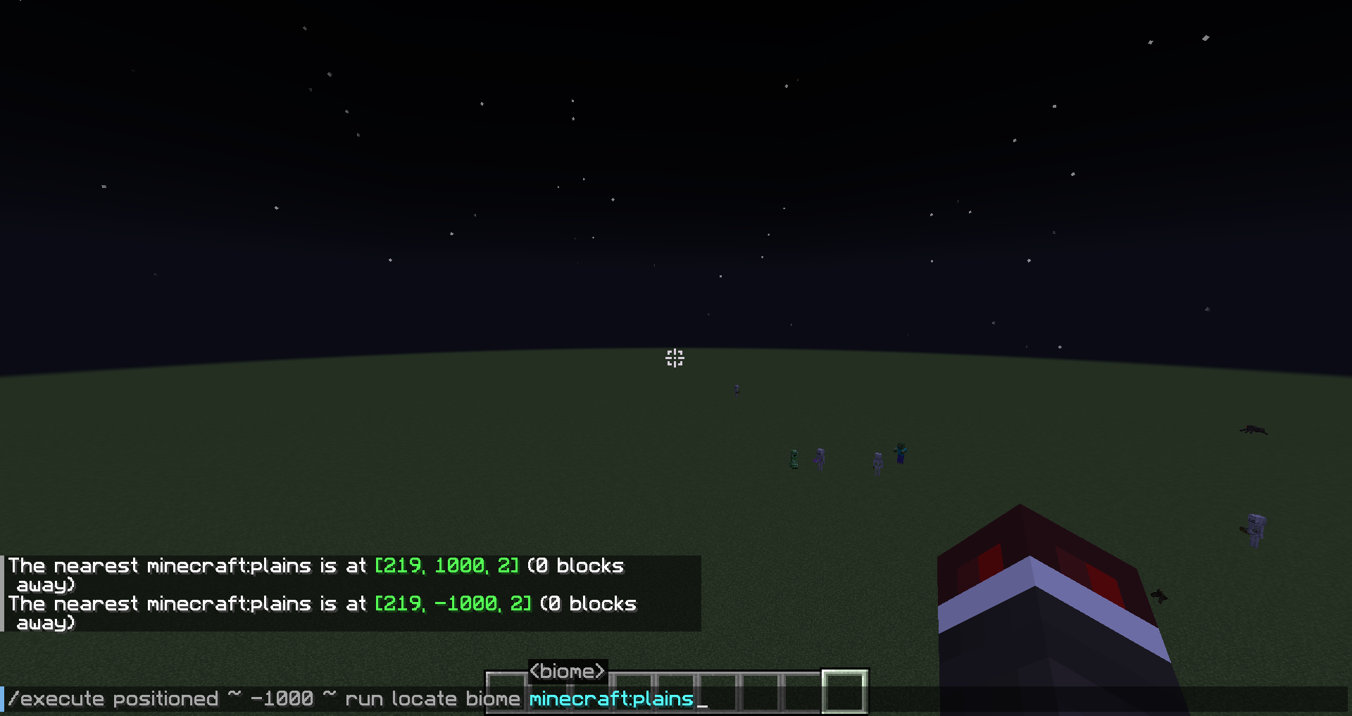 NOTE 2: this command will not fail if you are in a superflat world and you attempt to locate the biome present throughout the entire superflat world, regardless of the elevation from which the command is run. Only superflat worlds and default worlds have been tested in the discovery of this bug report. See attached image for superflat command response.