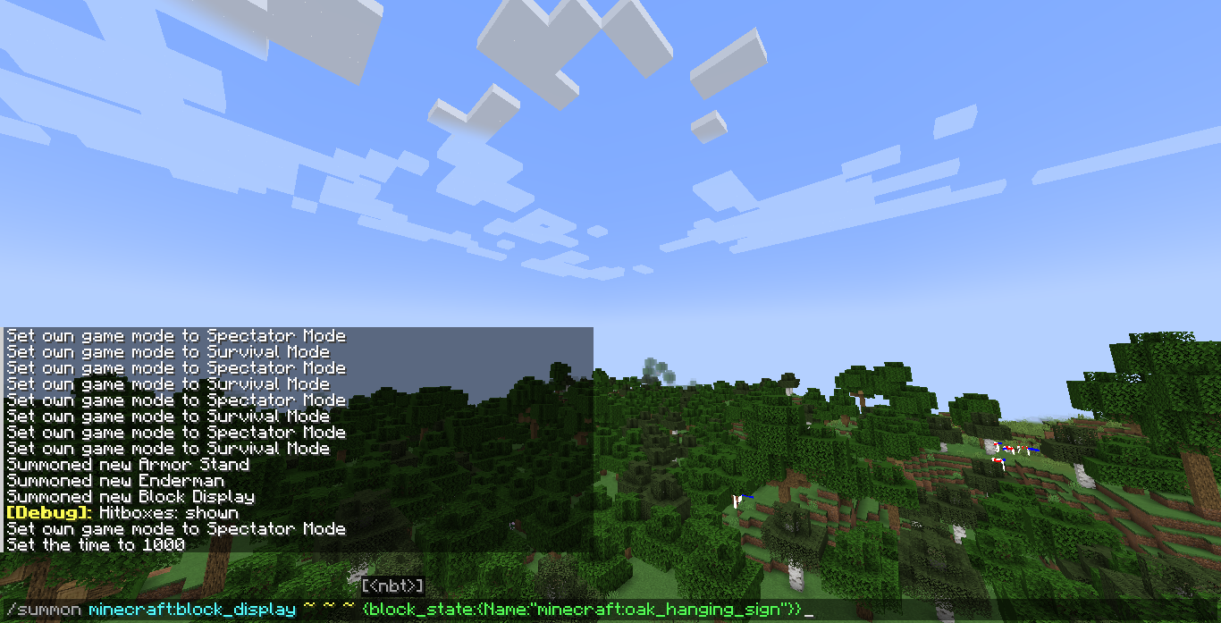/summon minecraft:enderman ~ ~ ~ {NoAI:1,carriedBlockState:{Name:"oak_hanging_sign"}}/summon minecraft:block_display ~ ~ ~ {block_state:{Name:"minecraft:oak_hanging_sign"}}Observed Result