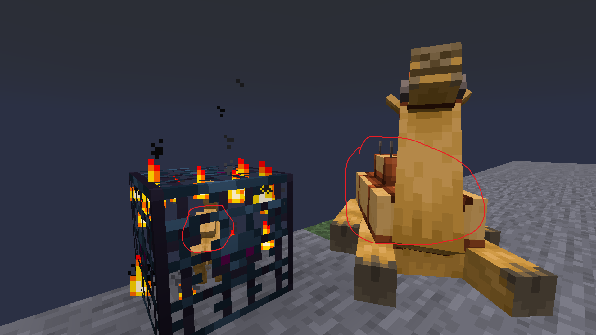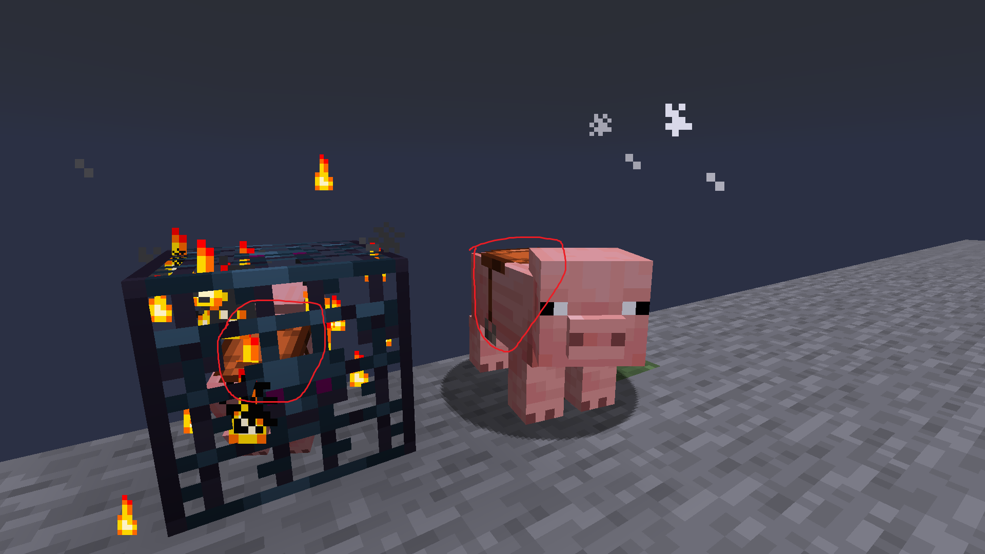 Now you can see that the mob spawner doesn't seem to mimic the saddle on the mob that spawns from it. You can use the following commands to give yourself a saddled pig or saddled strider spawner to see how I would expect the spawners to mimic the saddled mob.