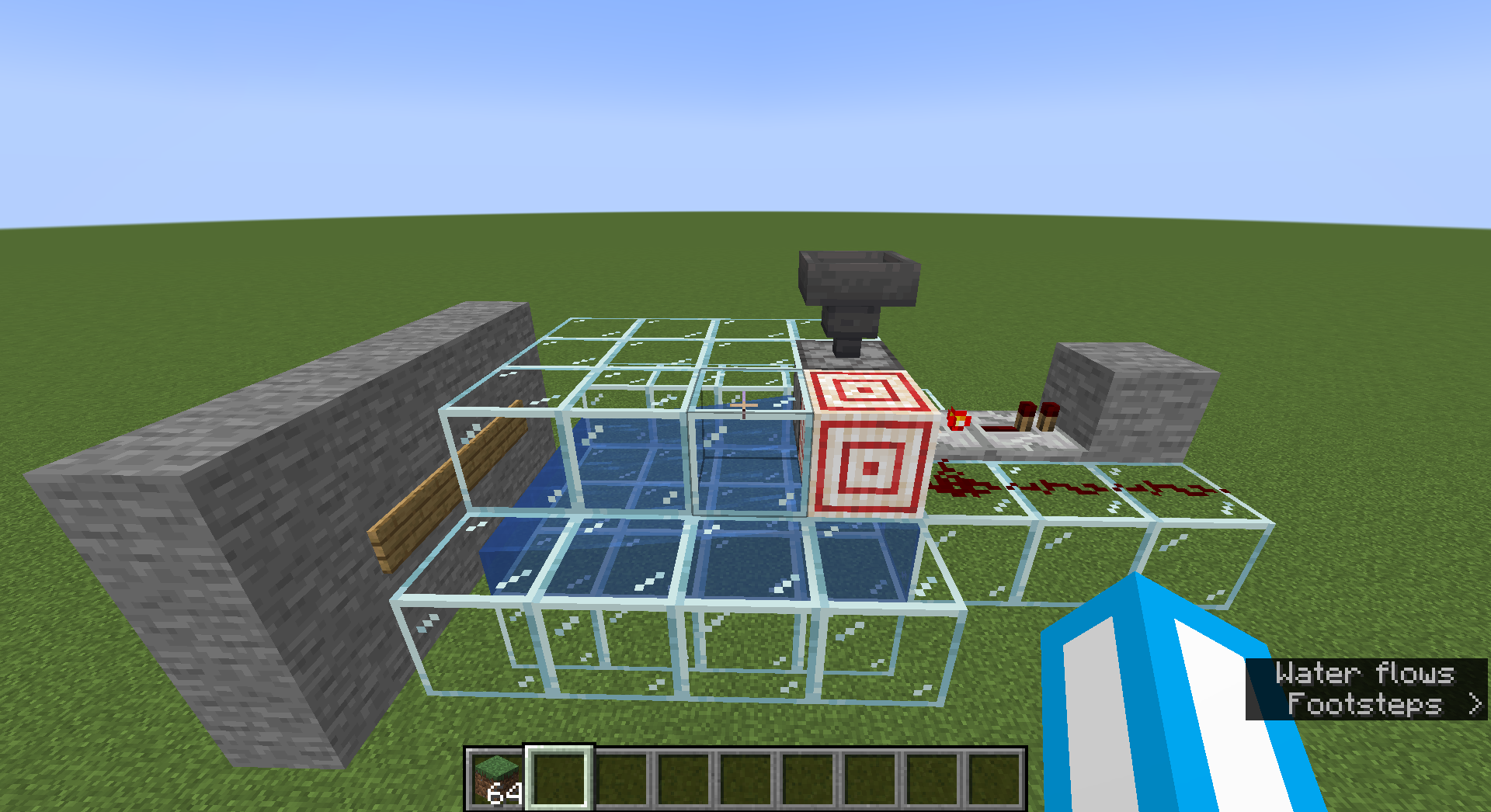 1. Create a machine that dispenses items into a wall, e.g. dropper into water stream into wall, facing North.
