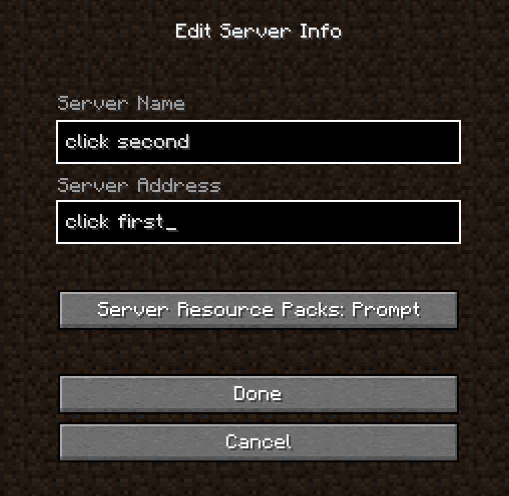 On the "Edit Server Info" screen it's possible to focus on both input fields by clicking on the "Server Address" field first and then on the "Server Name" field. Both fields are highlighted then and show a blinking cursor but only one of them actually changes when adding text.