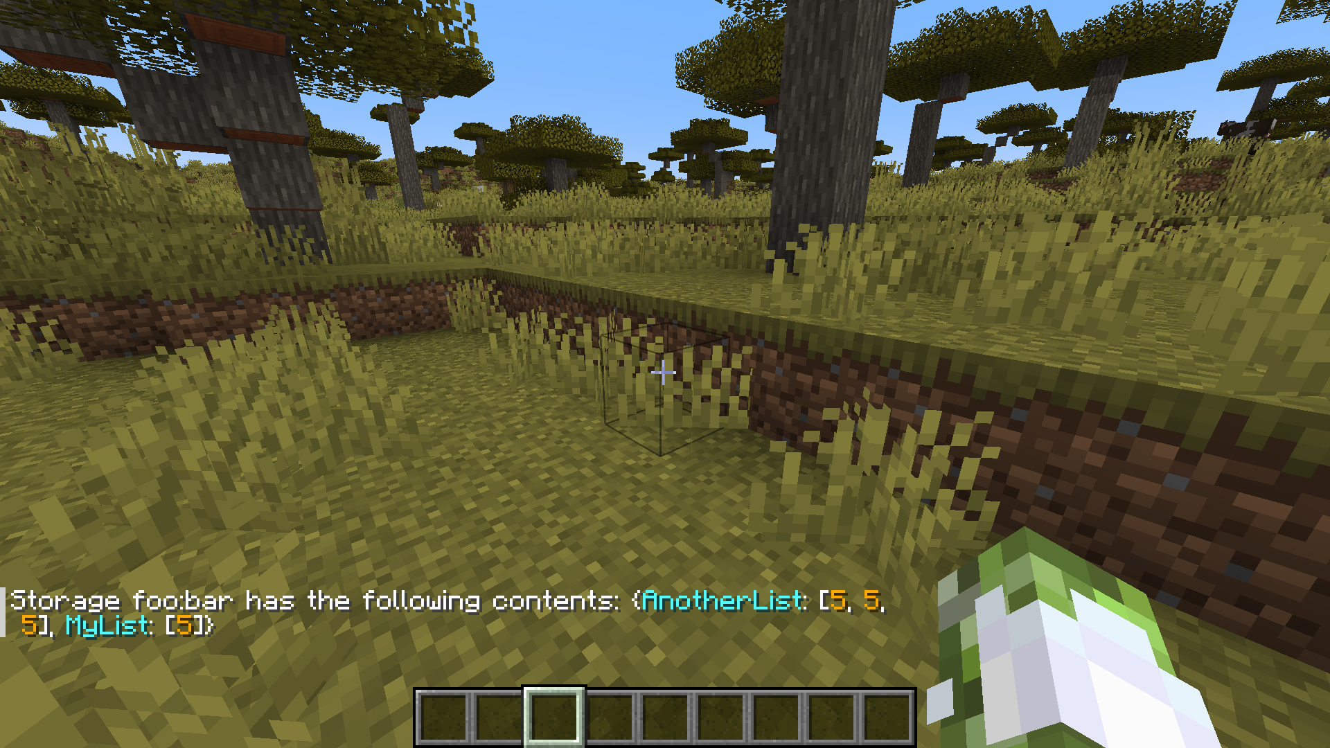 /data modify storage foo:bar MyList set value [] /data modify storage foo:bar AnotherList set value [1, 2, 3] /data modify storage foo:bar MyList[] set value 5 /data modify storage foo:bar AnotherList[] set value 5 /data get storage foo:bar