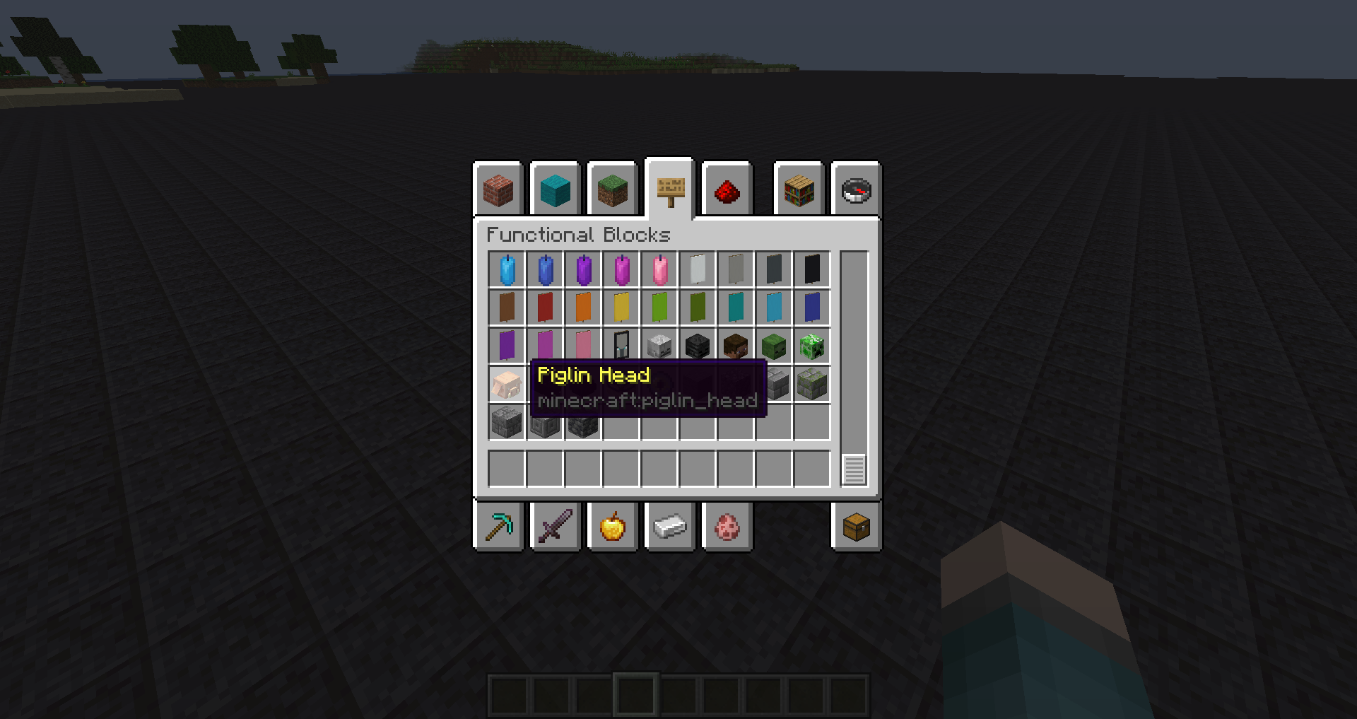 When I went into the Functional Blocks tab and scrolled down, all mob heads except the Piglin Mob Head was there. I also didnt find the Piglin Mob Head anywhere else in the Creative Tab.