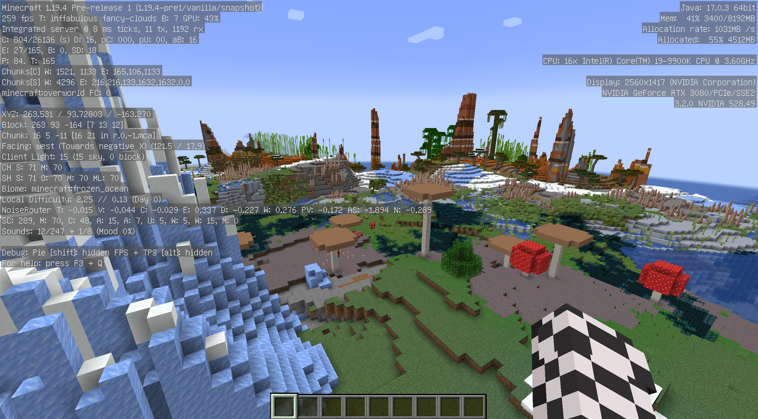 The attached datapack overrides the overworld dimension to use a checkerboard biome source that uses all biomes in the "#is_overworld" biome tag.