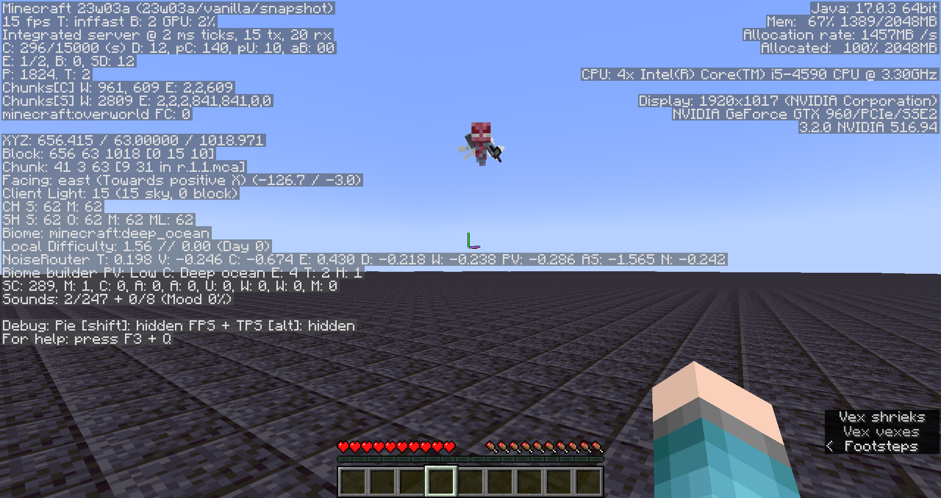 /summon minecraft:vex ~ ~ ~ {LeftHanded:1b,HandItems:[{id:"minecraft:iron_sword",Count:1b}]}Watch the arms of the vex closely as it shrieks/charges toward you.