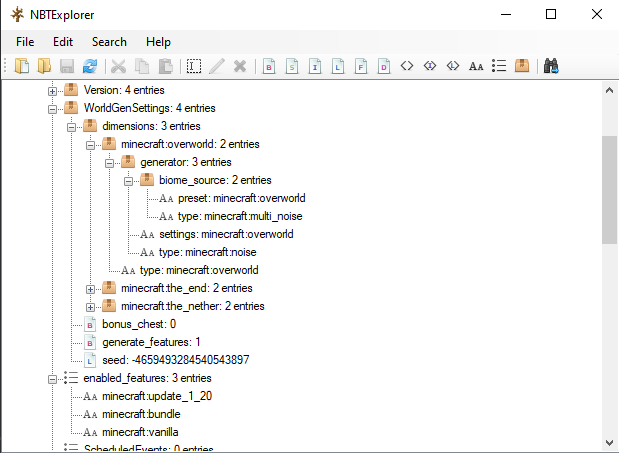 initial-enabled-packs=bundle,update_1_20,vanillaHowever, this line being missing is not the root cause of the issue, just a helpful note for those attempting to reproduce. The underlying cause is that worlds either updated from previous versions (i.e. 23w06a) with experimental settings enabled, or generated from a dedicated server with the aforementioned line in server.properties, will set the biome_source of the overworld generator in level.dat to "minecraft:overworld". In singleplayer 23w07a, creating a new world with experimental features enabled will instead set this value to "minecraft:overworld_update_1_20", which is the generator that allows the new Cherry Grove to generate.