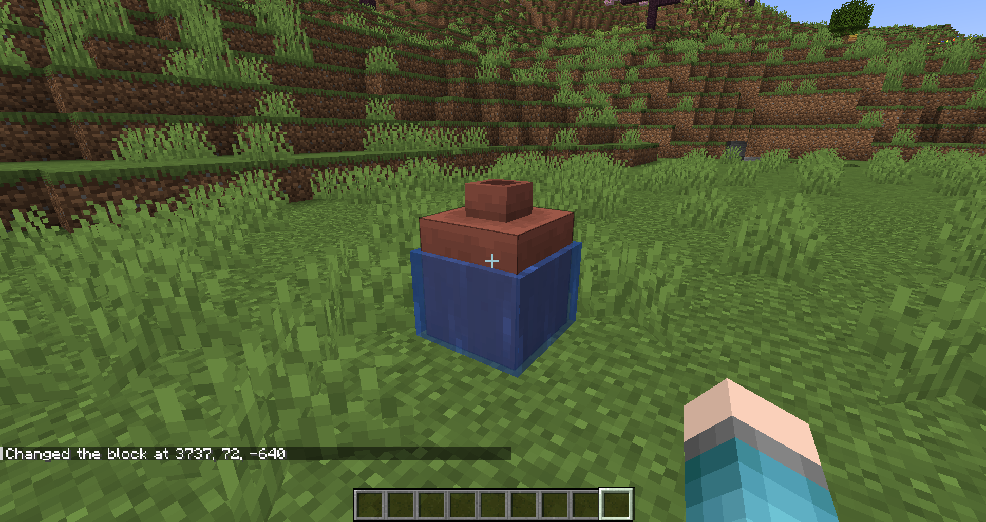 /setblock ~1 ~ ~1 minecraft:decorated_pot[waterlogged=true]Look at the water within the waterlogged decorated pot.