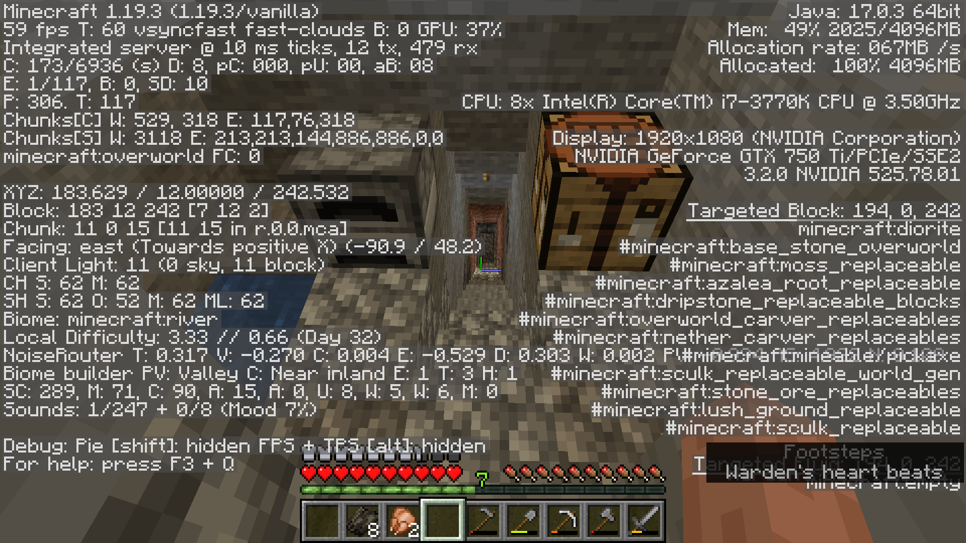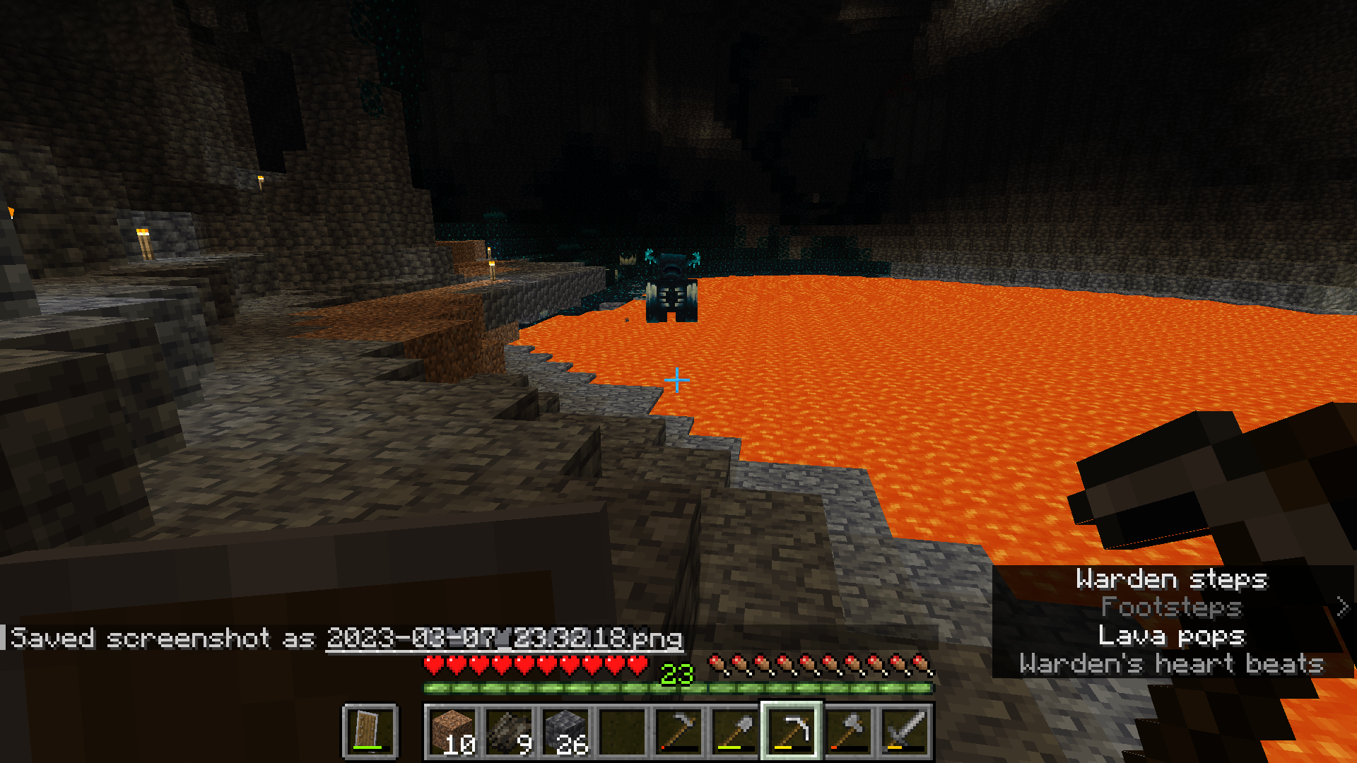 That's why it says "Warden Takes Notice" because I can still hear the Warden being agitated and active despite the fact that I am (in Minecraft terms) basically a MILE away from the creature, and I know this because I went back down the staircase only to find out the Warden was still mostly around the Deep Dark area.