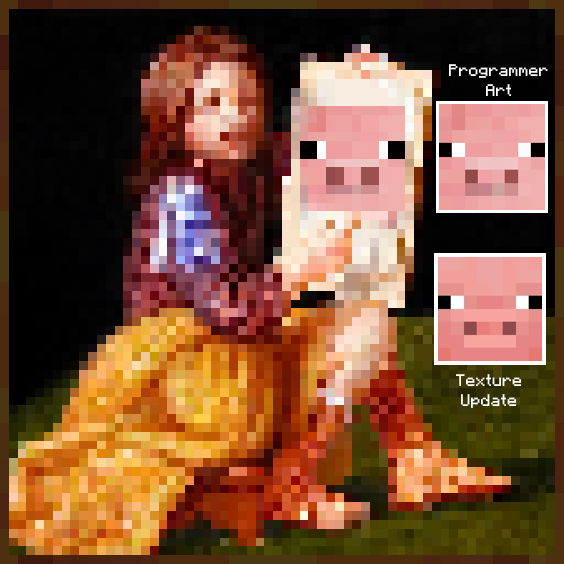 During 1.14's Texture Update, Pigs were given a new texture with new features like eyebrows and more professionally done shading. However, the Pigscene painting, which uses a stretched version of the original Programmer Art pig, was not updated to match.