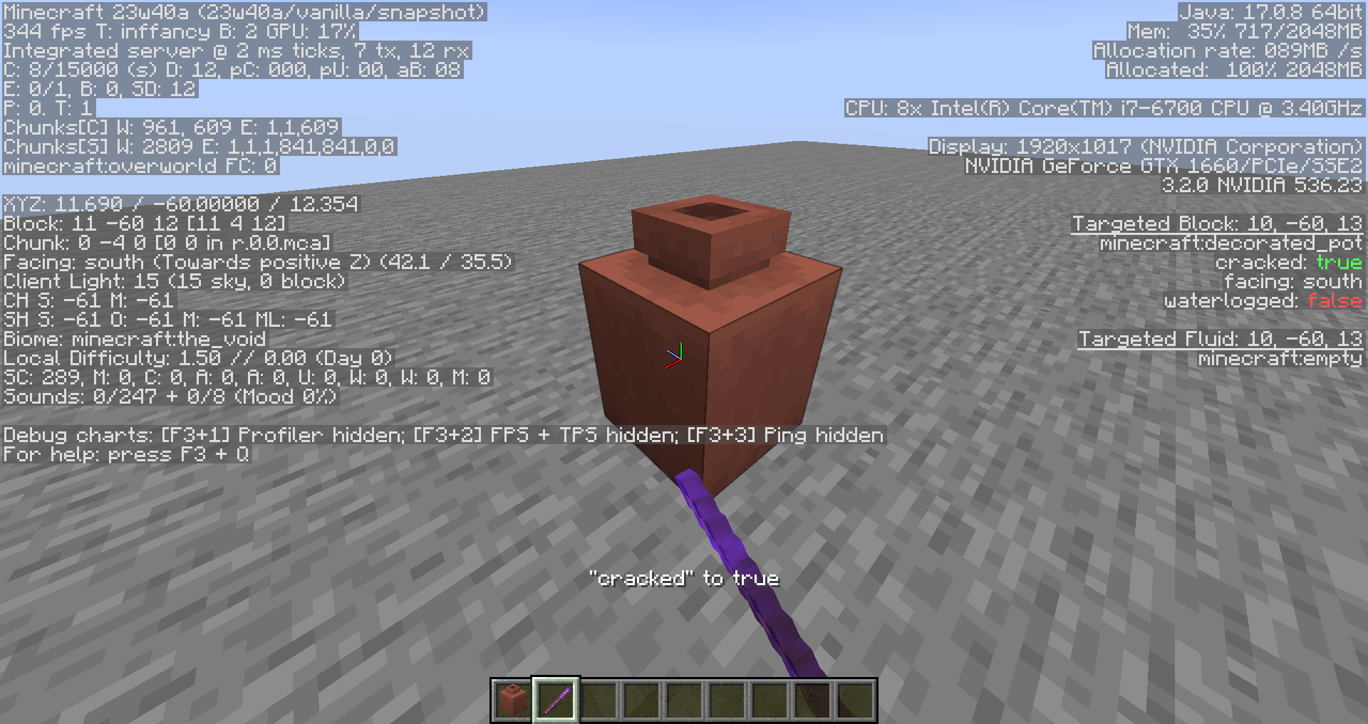Decorated pots has an unused cracked block state when left clicked with a debug stick.