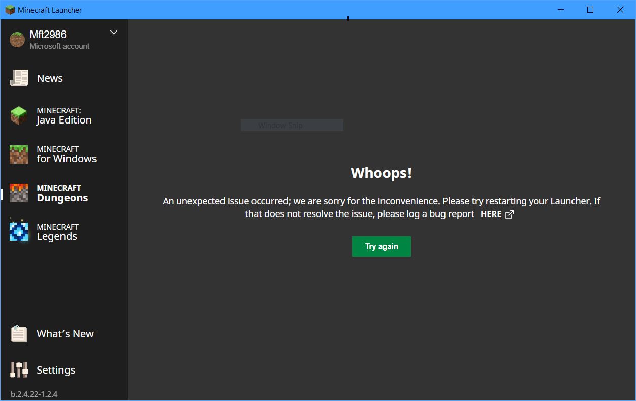 when i login in minecraft launcher there is just a text saying unexpected issue