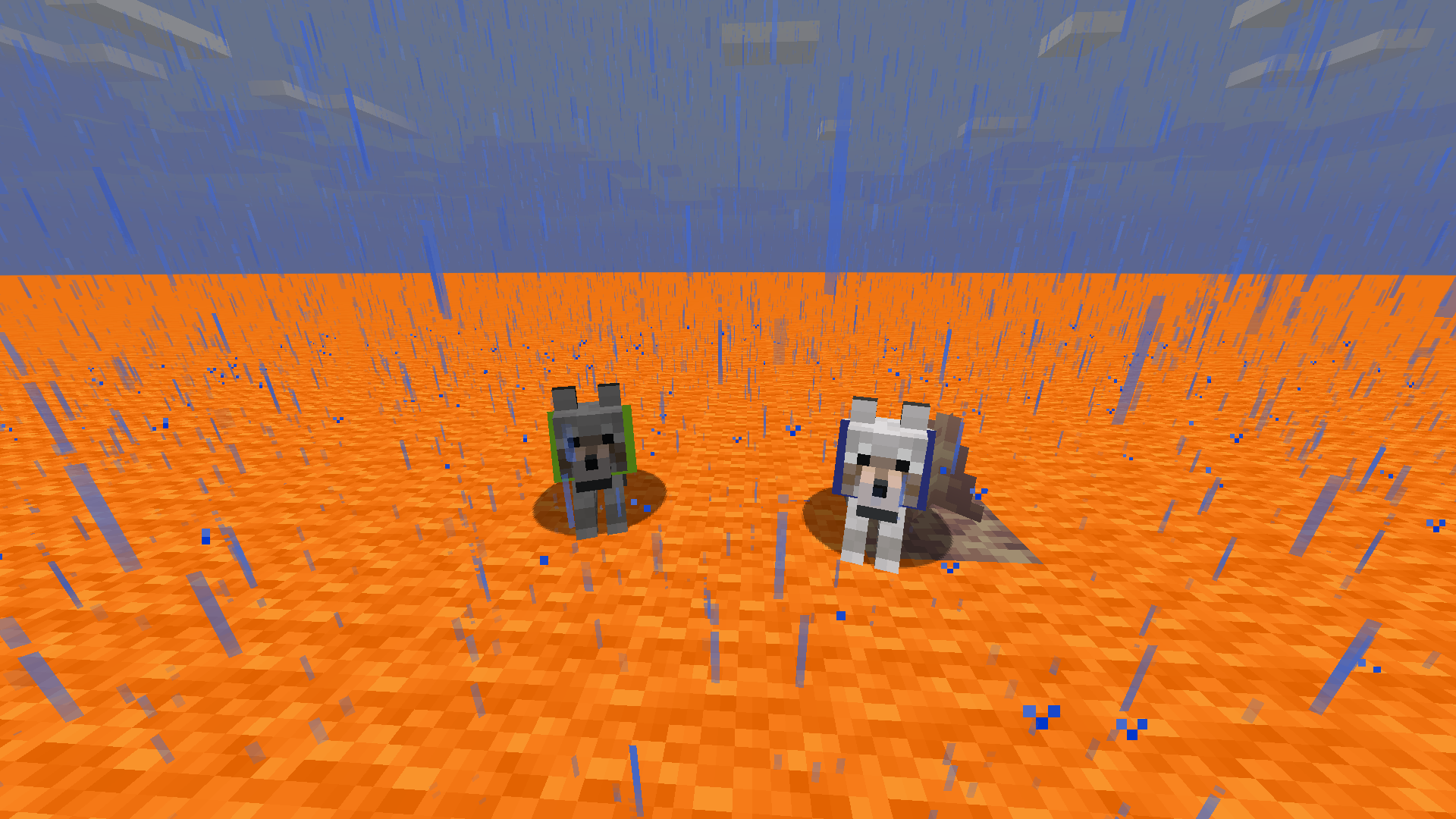 As shown in the provided screenshot, the left wolf and right wolf are both exposed to rain. The left dog is wet, as can be seen by its darkened fur. The dog on the right, however, is perfectly dry as a result of the presence of the pointed dripstone. Attempting to push an already wet dog into the dripstone will cause it to dry itself off and not get wet again. This occurs regardless of the height of the pointed dripstone.