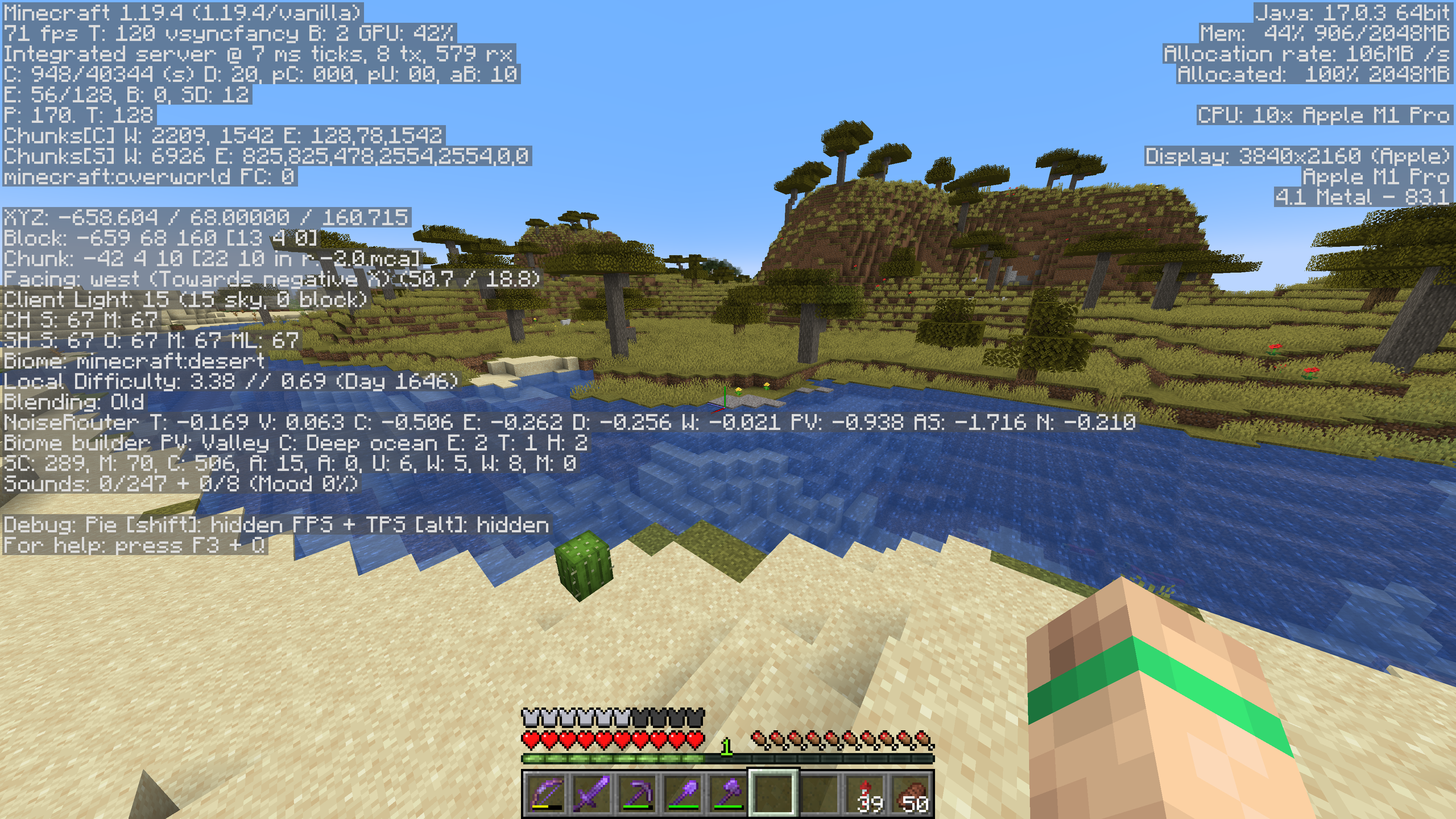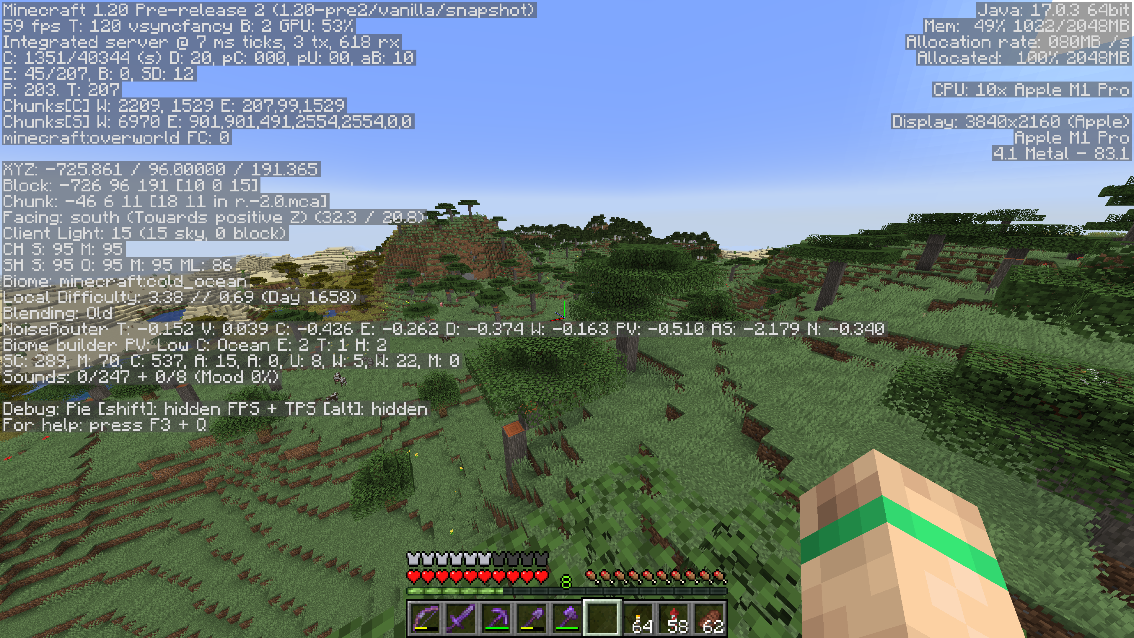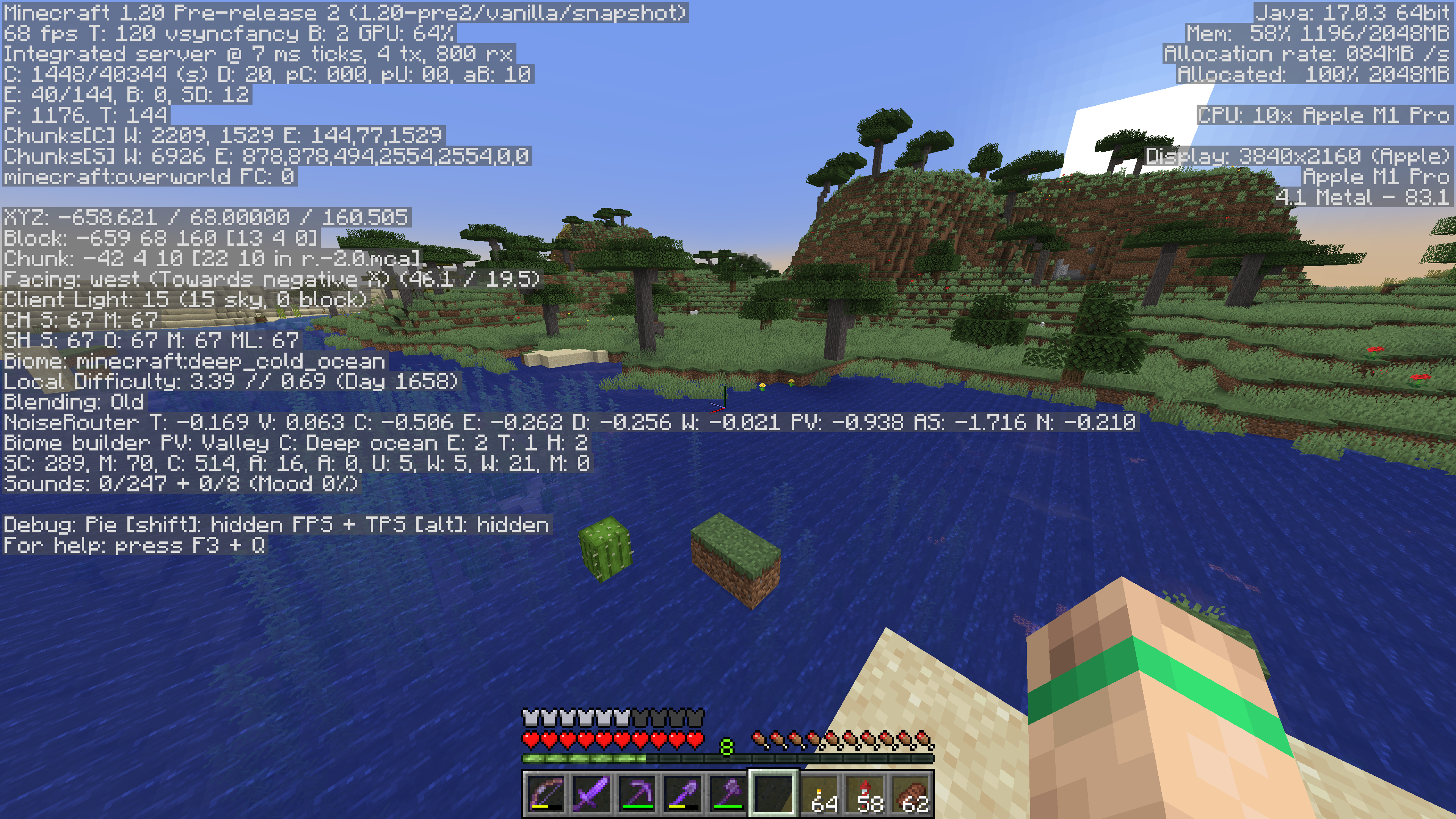 The attached screenshots show portions of a desert and savanna biome that were generated in version 1.19.4, and the same areas in version 1.20 pre2. In the 1.20 pre2, the area was partially regenerated / overwritten by various ocean biomes (Cold Ocean, Deep Cold Ocean).