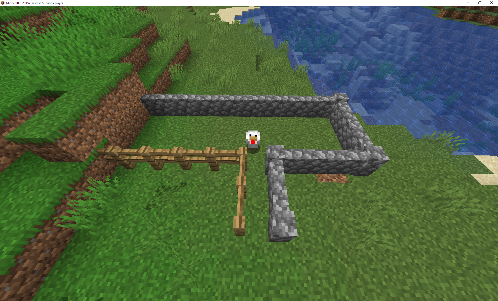 Build a setup similar to the attached image, such that there's a roughly 1-block gap between the fence and the wall where the chicken can fit.