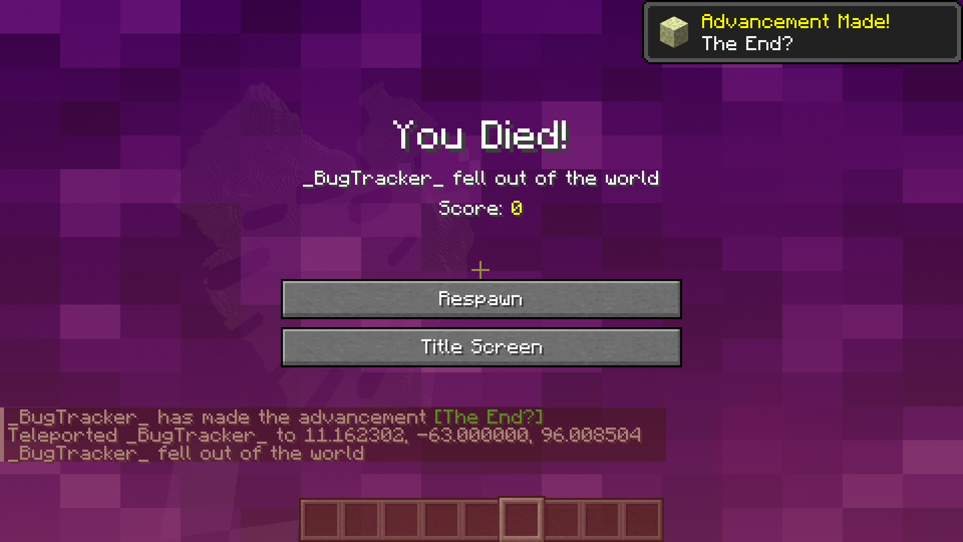 If the player changes dimensions - either via /execute in <dimension>, or upon exiting the End portal - with the Nausea effect active, the Nether Portal overlay will briefly appear and fade out a moment later. The nausea "wobble" will also disappear for a short time after the portal animation has concluded, though this may also just be a symptom of MC-196428.