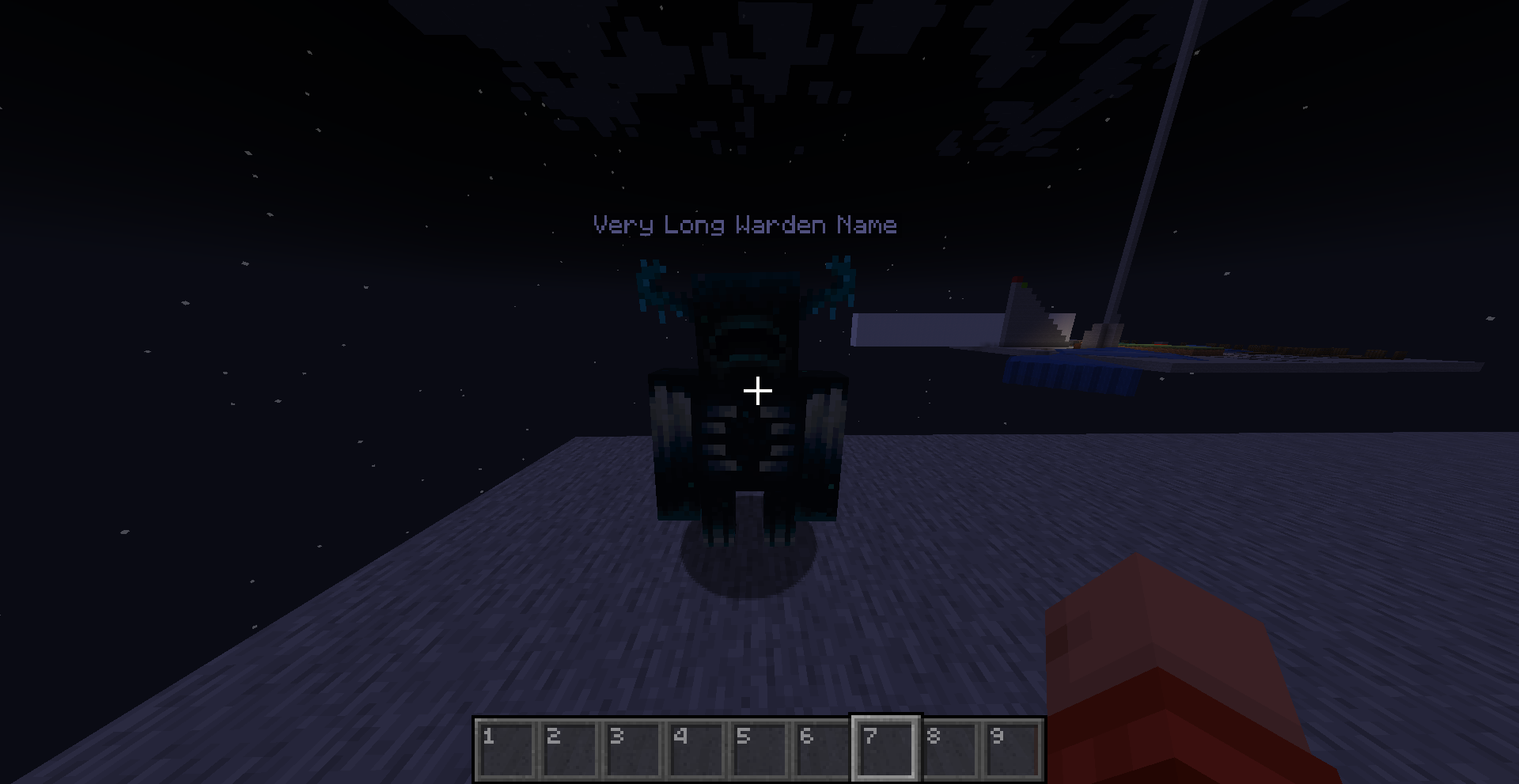 /summon minecraft:warden ~2 ~ ~ {NoAI:1b,Silent:1b,Rotation:[90f,0f],CustomNameVisible:1b,CustomName:"{\"text\":\"Very Long Warden Name\"}"}Look at the positioning of the warden's name tag.