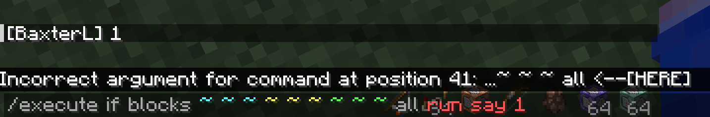 execute if blocks ~ ~ ~ ~ ~ ~ ~ ~ ~ all run say 1Here you are prompted with the wrong command argument, but the command can be executed