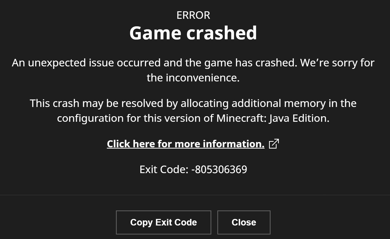 i was playing minecraft survival then my game crashed with exit code: -805306369