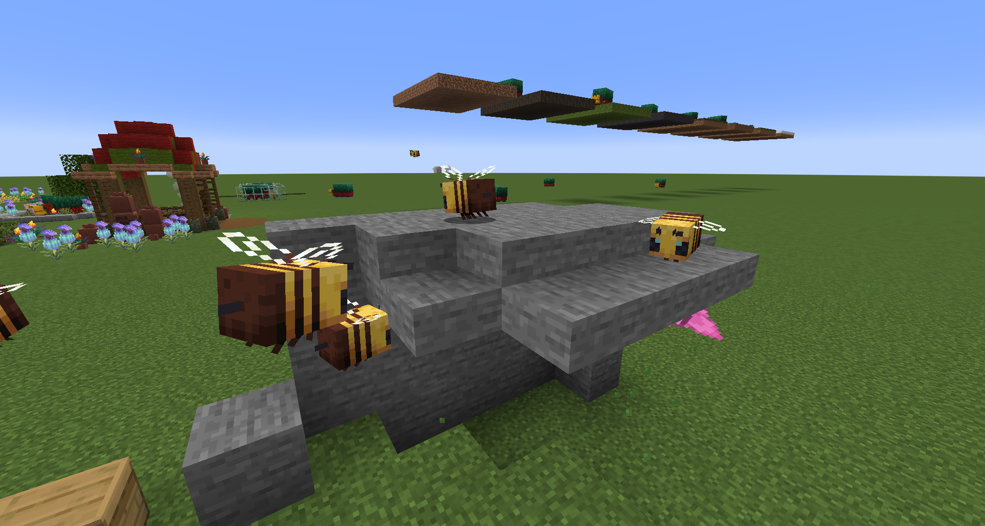 When pathfinding to a flower, sometimes they will try to pathfind through slabs to access them, resulting in them being stuck. However, with 23w33a letting bees pollinate spore blossoms now, this can happen even more often and even through full blocks, where they will try to spin even but can't reach the spore blossom.