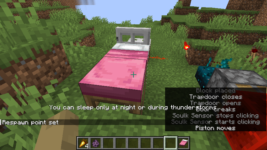 Text displayed above the hotbar, such as item names and certain prompts such as bed usage failures, are rendered underneath subtitle text, but render on top of the subtitle background.